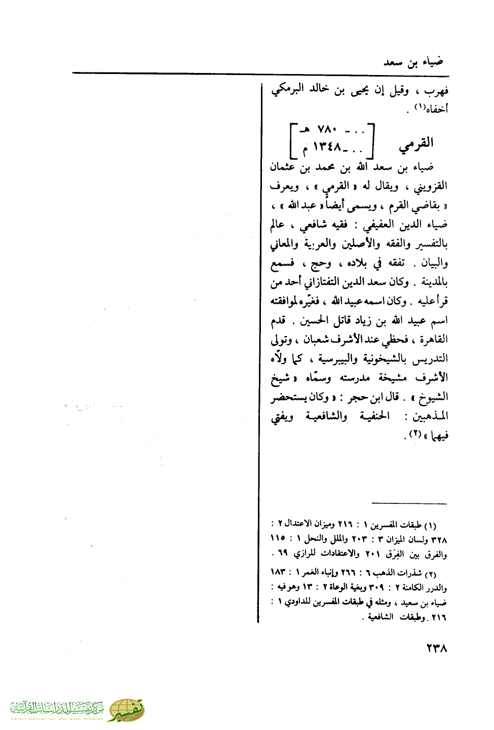 (¬2) شذرات الذهب 6: 266 وإنباء الغمر 1: 183 والدرر الكامنة 2: 309 وبغية الوعاة 2: 13 وهو فيه: ضياء بن سعيد، ومثله في طبقات المفسرين للداودي 1: 216. وطبقات الشافعية.