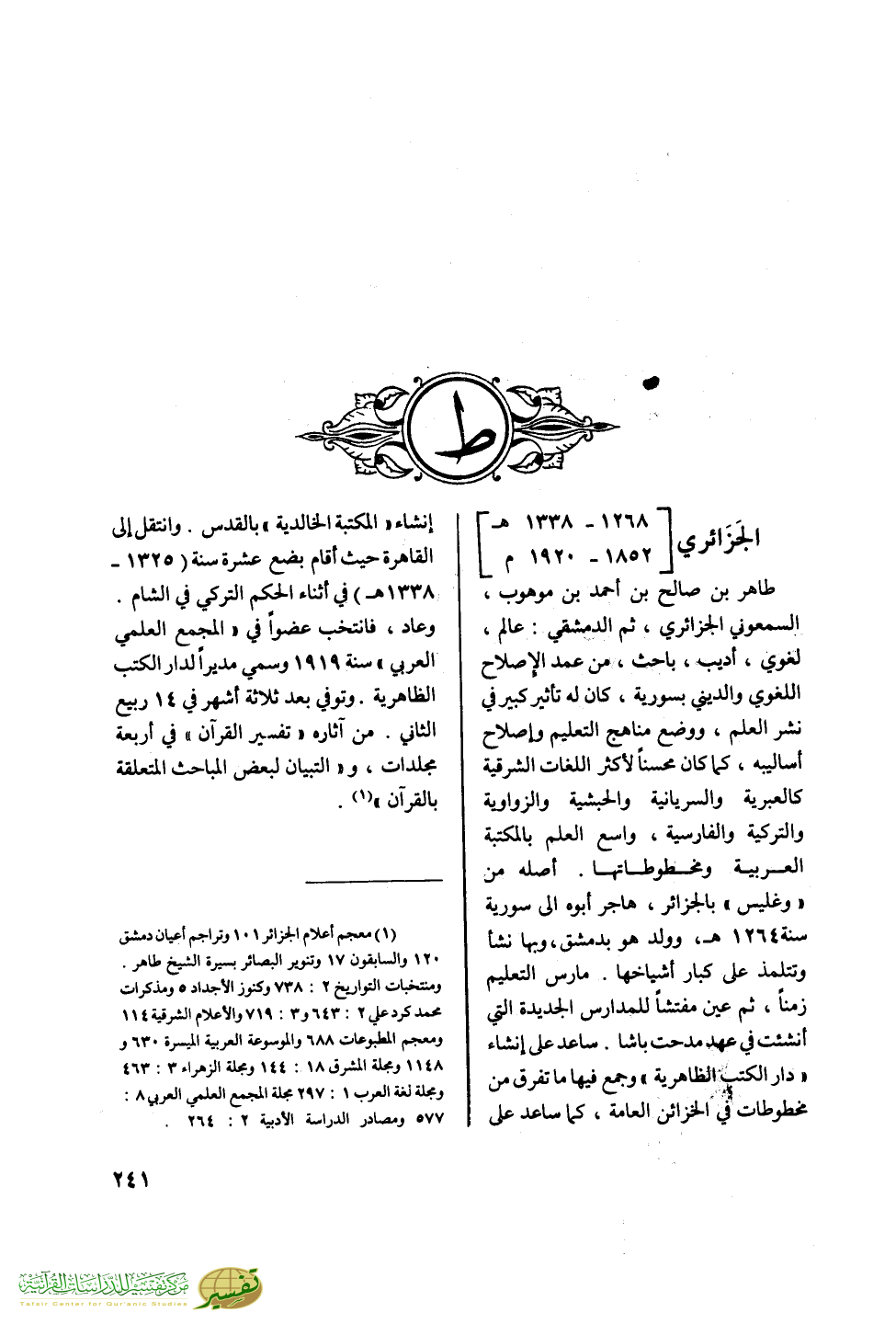 (¬1) معجم أعلام الجزائر 151 وتراجم أعيان دمشق 120 والسابقون 17 وتنوير البصائر بسيرة الشيخ طاهر. ومنتخبات التواريخ 2: 738 وكنوز الأجداد 5 ومذكرات محمد كرد علي 2: 643 و 3: 719 والأعلام الشرقية 114 ومعجم المطبوعات 688 والموسوعة العربية الميسرة 630 و 1148 ومجلة الشرق 18: 144 ومجلة الزهراء3: 463 ومجلة لغة العرب 1: 297 مجلة المجمع العلمي العربي 8: 577 ومصادر الدراسة الأدبية 2: 264.