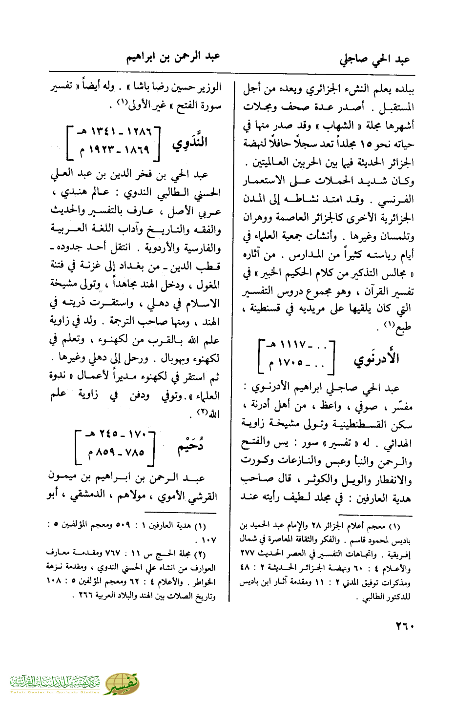 (¬2) مجلة الحج س11: 7670 ومقدمة معارف العوارف من إنشاء علي الحسني الندوي، ومقدمة نزهة الخواطر. والأعلام 4: 62 ومعجم المؤلفين 5: 108 وتاريخ الصلات بين الهند والبلاد العربية 266.