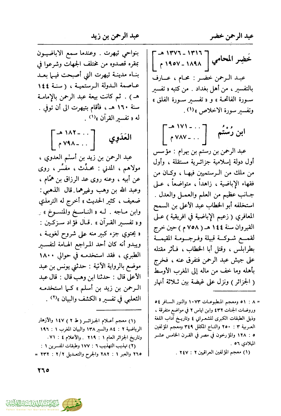 بنواحي تيهرت. وعندما سمع الإباضيون بمقره قصدوه من مختلف الجهات وشرعوا في بناء مدينة تيهرت التي أصبحت فيما بعد عاصمة الدولة الرستمية، (سنة 144 هـ). ثم كانت بيعة عبد الرحمن بالإمامة سنة 160 هـ، فأقام بتيهرت إلى أن توفي. له "تفسير القرآن" (¬1).