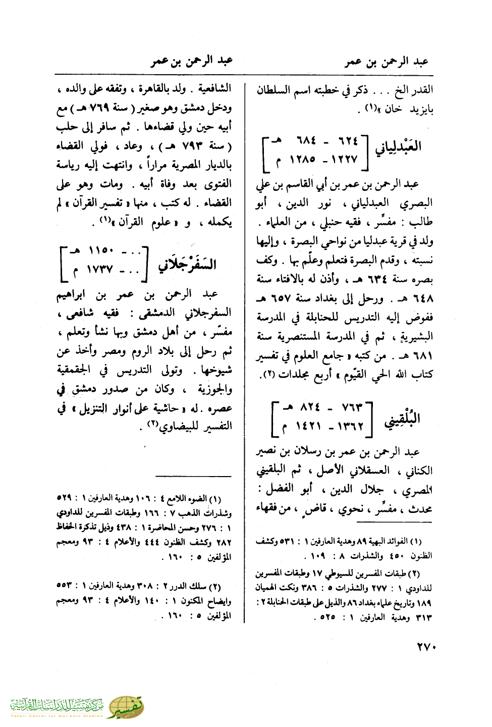 (¬1) الضوء اللامع 4: 156 وهدية العارفين 1: 529 وشذرات الذهب 7: 166 وطبقات المفسرين للداودي 1: 276 وحسن المحاضرة 1: 438 وذيل تذكرة الحفاظ 282 وكشف الظنون 444 والأعلام 4: 93 ومعجم المؤلفين 5: 160.