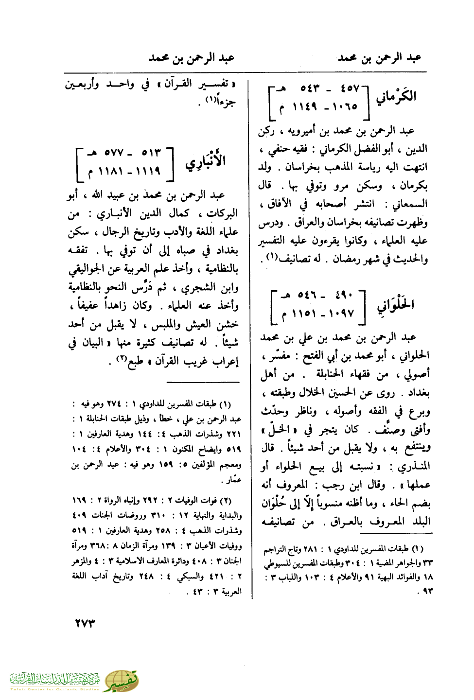 (¬1) طبقات المفسرين للداودي 1: 274 وهو فيه: عبد الرحمن بن علي، خطأ، وذيل طبقات الحنابلة 1: 221 وشذرات الذهب 4: 144 وهدية العارفين 1: 519 وإيضاح المكنون 1: 304 والأعلام 4: 104 ومعجم المؤلفين 5: 159 وهو فيه: عبد الرحمن بن عمار.