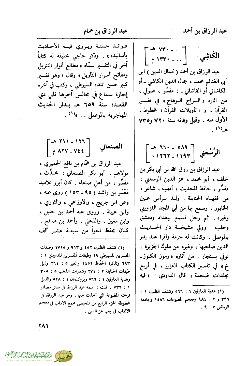 (¬1) كشف الظنون 452 و 913 و 1715 وطبقات المفسرين للسيوطى 19 وطبقات المفسرين للداودي 1: 293 وتذكرة الحفاظ 1452 والعبر 5: 264 وذيل طبقات الحنابلة 2: 274 وشذرات الذهب 5: 305 وهدية العارفين 1: 566 وبروكلمان 1: 528 والذيل 1: 736. قلت: اسمه عبد الرزاق في سائر مصادر ترجمته المطبوعة التي أخذت عنها. وهو عبد الرزاق في مخطوطة الجزء الرابع من تلخيص مجمع الآداب في معجم الألقاب في باب عز الدين.