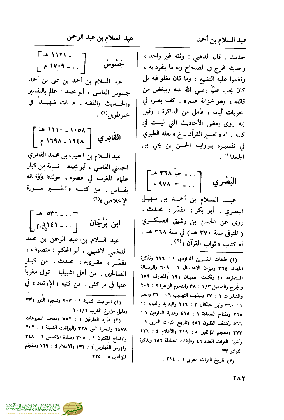 (¬1) طبقات المفسرين للداودي 1: 296 وتذكرة الحفاظ 364 وميزان الاعتدال 2: 609 والرسالة المستطرفة 40 ونكت الهميان 191 والمعارف 259 والجرح والتعديل 3/ 1: 38 والنجوم الزاهرة 2: 202 والشذرات 2: 37 وتهذيب التهذيب 6: 310 والعبر 1: 365 وابن خلكان 3: 296 والبداية والنهاية 1: 265 ومفتاح السعادة 1: 415 وهدية العارفين 1: 566 وكشف الظنون 452 وتاريخ التراث العربي 1: 277 ومعجم المؤلفين 5: 219 والأعلام 4: 126 وأخبار التراث العدد 46 وطبقات الحنابلة 152 وتذكرة النوادر 33.