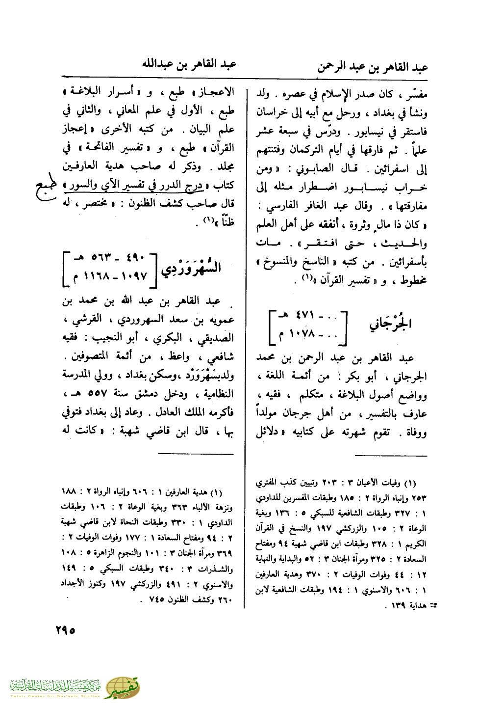 من أئمة اللغة، وواضع أصول البلاغة، متكلم، فقيه، عارف بالتفسير، من أهل جرجان مولدا ووفاة. تقوم شهرته على كتابيه "دلائل