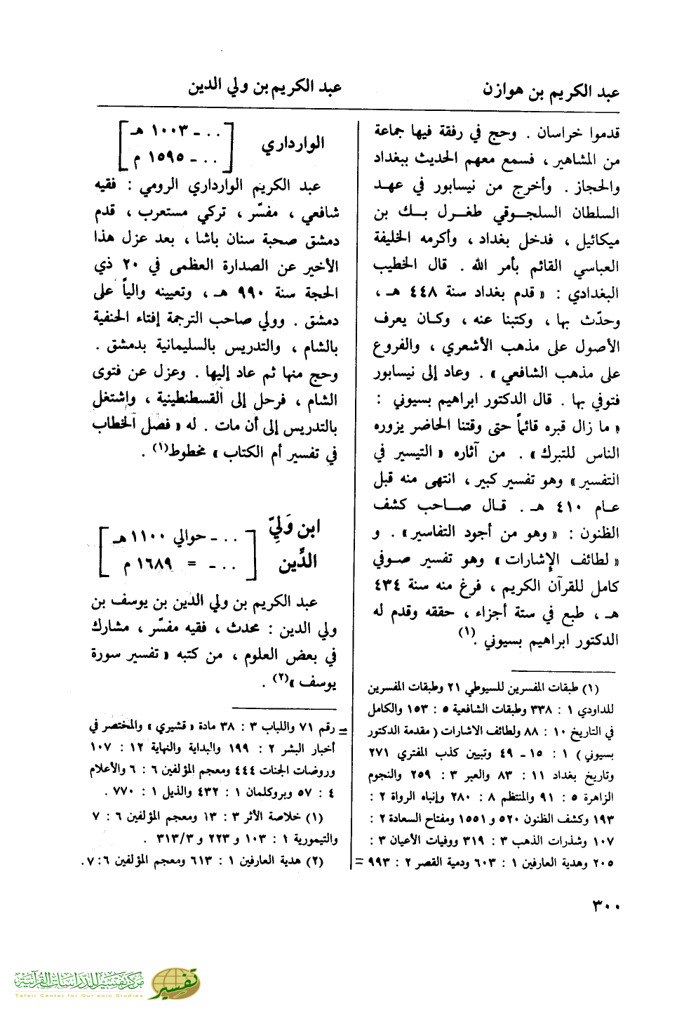 (¬1) طبقات المفسرين للسيوطي 21 وطبقات المفسرين للداودي 1: 338 وطبقات الشافعية 5: 153 والكامل في التاريخ 10: 88 ولطائف الإشارات (مقدمة الدكتور بسيوني) 1: 15 - 49 وتبيين كذب المفتري 271 وتاريخ بغداد 11: 83 والعبر 3: 259 والنجوم الزاهرة 5: 91 والمنتظم 8: 280 وإنباء الرواة 2: 193 وكشف الظنون 520 و 1551 ومفتاح السعادة 2: 107 وشذرات الذهب 3: 319 ووفيات الأعيان 3: 205 وهدية العارفين 1: 603 ودمية القصر 2: 993 =
