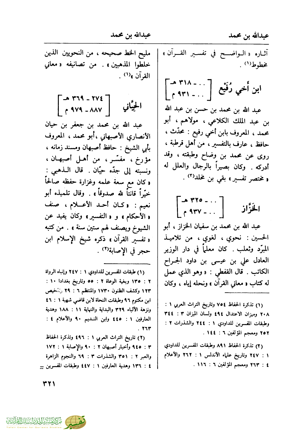 (¬1) تذكرة الحفاظ 754 وتاريخ التراث العربي 1: 208 وميزان الاعتدال 494 ولسان الميزان 3: 344 وطبقات المفسرين للداودي 1: 244 والشذرات 2: 252 ومعجم المؤلفين 6: 144.