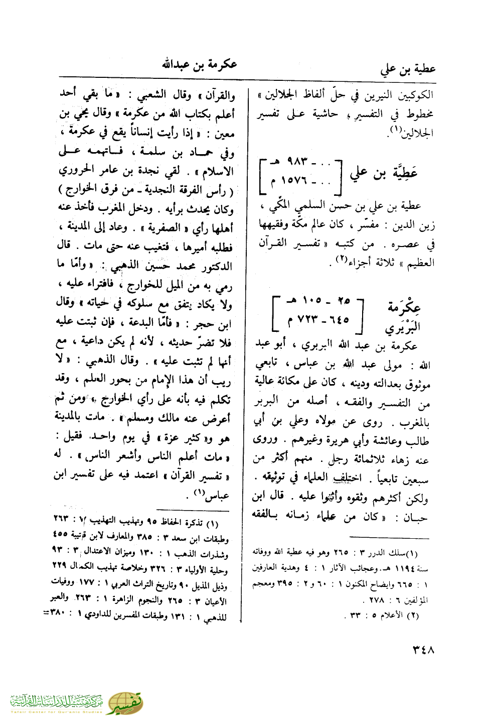 والقرآن" وقال الشعبي: "ما بقي أحد أعلم بكتاب الله من عكرمة، وقال يحيى بن معين: "إذا رأيت إنسانا يقع في عكرمة، وفي حماد بن سلمة، فاتهمه على الإسلام". لقي نجدة بن عامر الحروري (رأس الفرقة النجدية - من فرق الخوارج) وكان يحدث برأيه. ودخل المغرب فأخذ عنه أهلها رأي "الصفوية". وعاد إلى المدينة، فطلبه أميرها، فتغيب عنه حتى مات. قال الدكتور محمد حسين الذهبي: "وأما ما رمي به من الميل للخوارج، فافتراء عليه، ولا يكاد يتفق مع سلوكه في حياته" وقال ابن حجر: "فأما البدعة، فإن ثبتت عليه فلا تضر حديثه، لأنه لم يكن داعية، مع أنها لم تثبت عليه". وقال الذهبي: "لا ريب أن هذا الإمام من بحور العلم، وقد تكلم فيه بأنه على رأي الخوارج، ومن ثم أعرض عنه مالك ومسلم". مات بالمدينة هو و "كثير عزة) في يوم واحد، فقيل: "مات أعلم الناس وأشعر الناس". له "تفسير القرآن" اعتمد فيه على تفسير ابن عباس (¬1).
