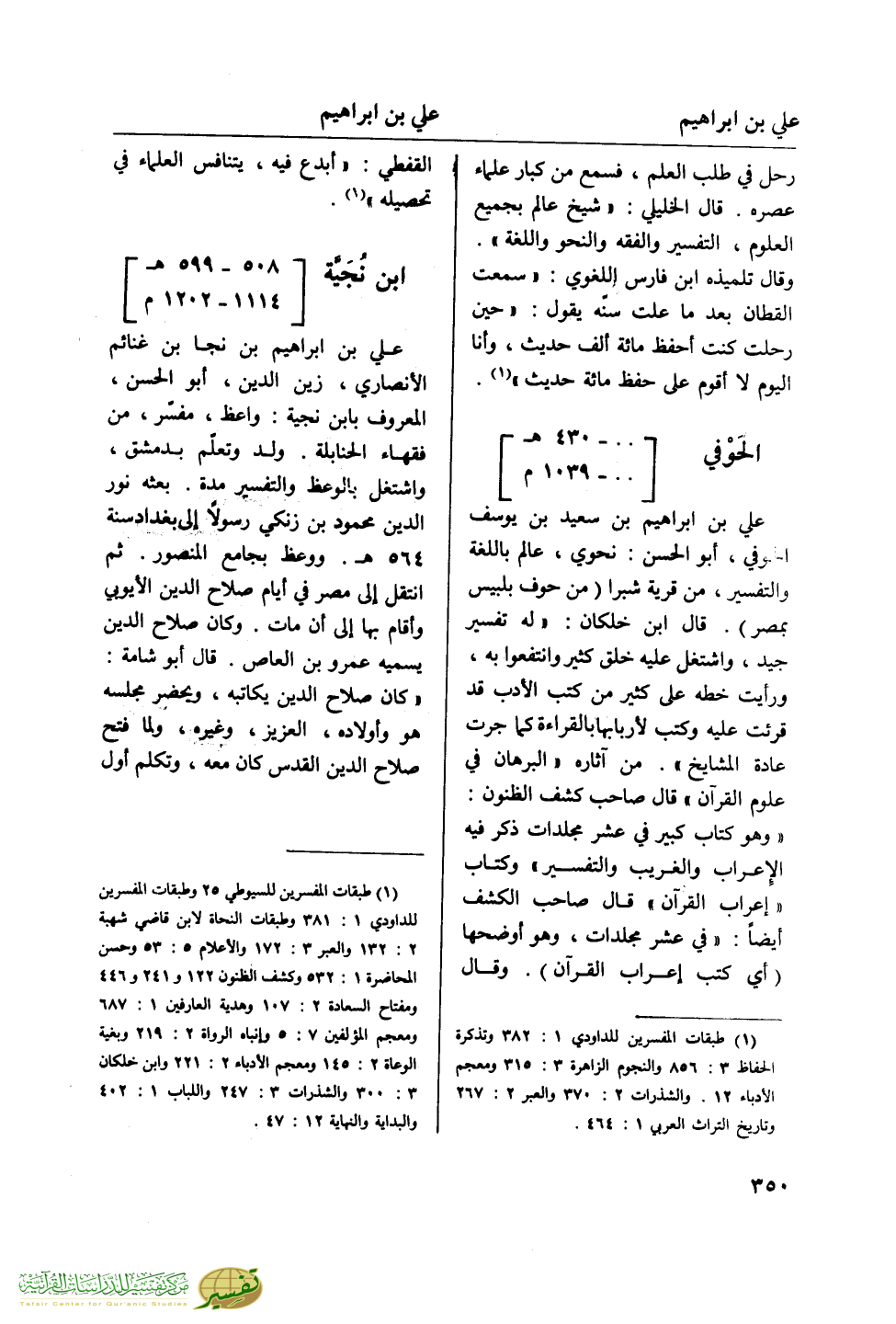 (¬1) طبقات المفسرين للداودي 1: 382 وتذكرة الحفاظ 3: 856 والنجوم الزاهرة 3: 315 ومعجم الأدباء 12. والشذرات 2: 270 والعبر 2: 267 وتاريخ التراث العربي 1: 464.