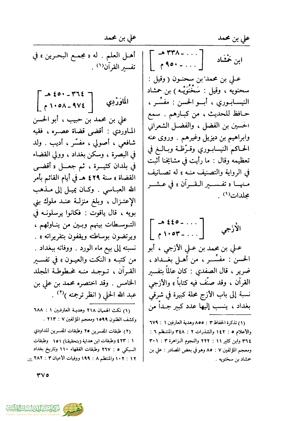 (¬1) تذكرة الحفاظ 3: 855 وهدية العارفين 1: 679 والأعلام 5: 142 والشذرات 2: 348 والمنتظم 6: 364 وابن كثير 11: 222 والنجوم الزاهرة 3: 301 ومعجم المؤلفين 7: 85 وهو في بعض المصادر: علي بن حمشاد بن سختويه.