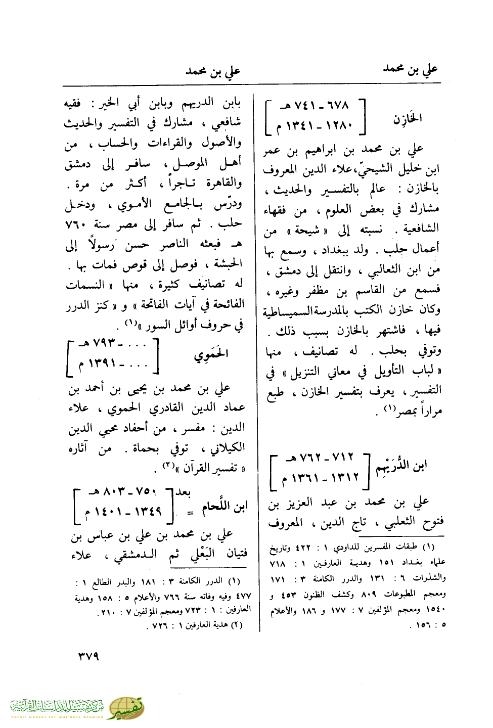 (¬1) طبقات المفسرين للداودي 1: 422 وتاريخ علماء بغداد 151 وهدية العارفين 1: 718 والشذرات 6: 131 والدرر الكامنة 3: 171 ومعجم المطبوعات 809 وكشف الظنون 453 و 1540 ومعجم المؤلفين 7: 177 و 186 والأعلام 5: 156.