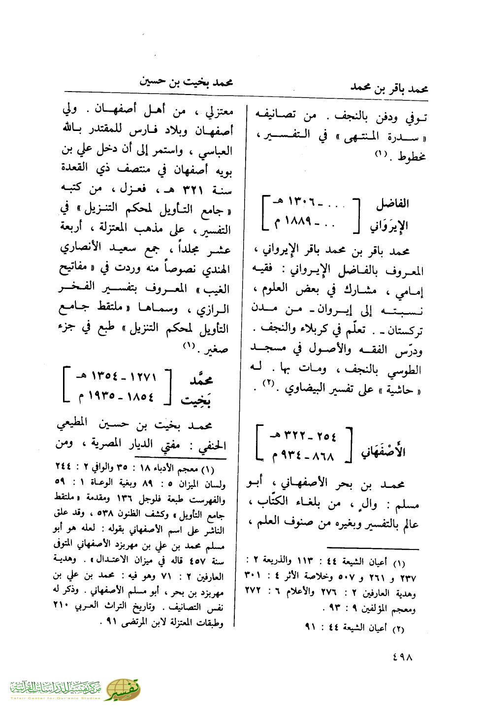 (¬1) معجم الأدباء 18: 35 والوافي 2: 244 ولسان الميزان 5: 89 وبغية الوعاة 1: 59 والفهرست طبعة فلوجل 136 ومقدمة "ملتقط جامع التأويل" وكشف الظنون 538، وقد علق الناشر على اسم الأصفهاني بقوله: لعله هو أبو مسلم محمد بن علي بن مهربزد الأصفهاني المتوفى سنة 457 قاله في ميزان الاعتدال". وهدية العارفين 2: 71 وهو فيه: محمد بن علي بن مهربزد بن بحر، أبو مسلم الأصفهاني. وذكر له نفس التصانيف. وتاريخ التراث العربي 210 وطبقات المعتزلة لابن المرتضى 91.
