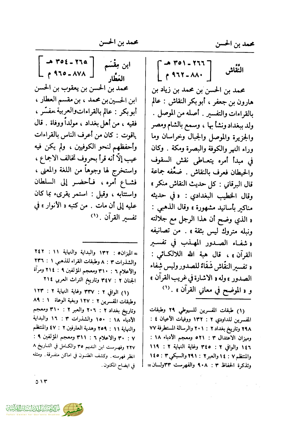 (¬1) طبقات المفسرين للسيوطي 29 وطبقات المفسرين للداودي 2: 132 ووفيات الأعيان 4: 298 وتاريخ بغداد 2: 201 والرسالة المستطرفة 77 وميزان الاعتدال 3: 521 ومعجم الأدباء 18: 146 والوافي 2: 345 وغاية النهاية 2: 119 والمنتظم 7: 14 والعبر 2: 291 والسبكي 3: 145 وتذكرة الحفاظ 3: 908 والفهرست 33 ولسان =