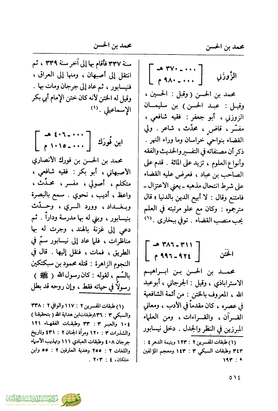 (¬1) طبقات المفسرين 2: 117 والوافي 2: 228 والسبكي 3: 136 وطبقات بن هداية الله (بتحقيقنا) 104 والعبر 3: 33 وطبقات الفقهاء 121 والشذرات 3: 120 ومرآة الجنان 2: 431 وتاريخ جرجان 408 وطبقات العبادي 111 وتهذيب الأسماء واللغات 2: 255 وهدية العارفين 2: 55 وابن خلكان 4: 203.
