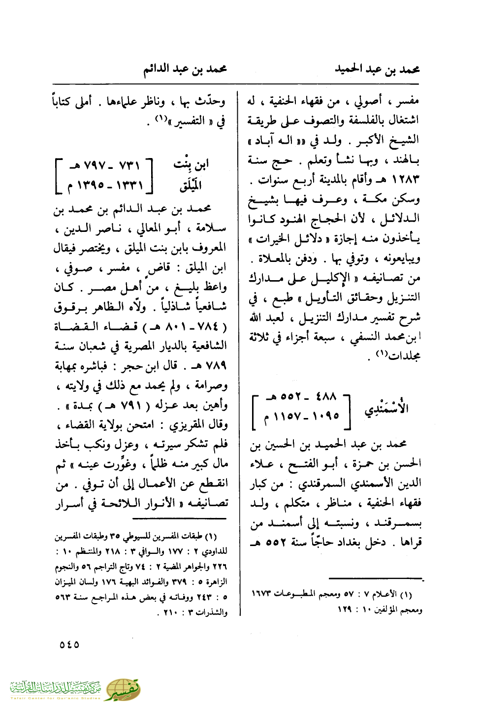 (¬1) طبقات المفسرين للسيوطي 35 وطبقات المفسرين للداودي 2: 177 والوافي 3: 218 والمنتظم 10: 226 والجواهر المضية 2: 74 وتاج التراجم 56 والنجوم الزاهرة 5: 379 والفوائد البهية 176 ولسان الميزان 5: 243 ووفاته في بعض هذه المراجع سنة 563 والشذرات 3: 210.