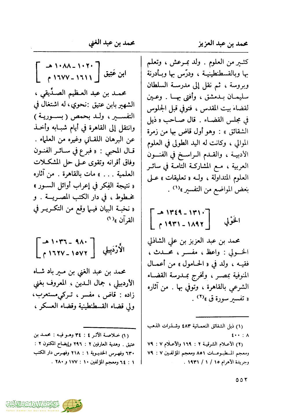 (¬1) خلاصة الأثر 4: 34 وهو فيه: محمد بن عتيق. وهدية العارفين 2: 296 وإيضاح المكنون 2: 630 وفهرس الخديوية 1: 218 وفهرس دار الكتب 1: 64 ومعجم المؤلفين 10: 177 و 280.