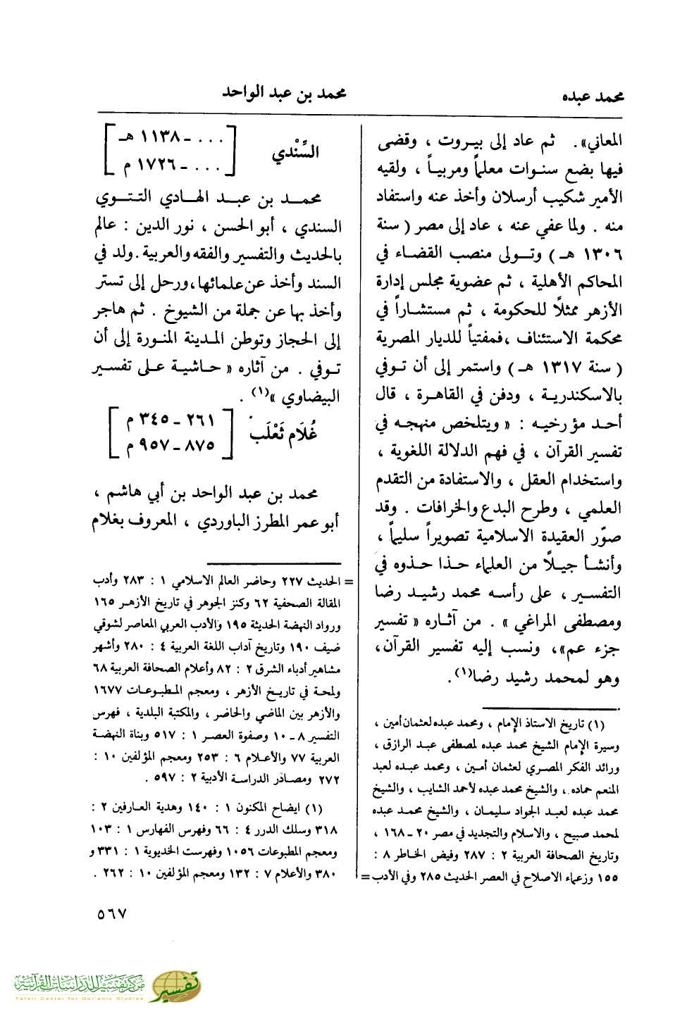 (¬1) تاريخ الأستاذ الإمام، ومحمد عبده لعثمان أمين، وسيرة الإمام الشيخ محمد عبده لمصطفى عبد الرازق، ورائد الفكر المصري لعثمان أمين، ومحمد عبده لعبد المنعم حمادة، والشيخ محمد عبده لأحمد الشايب، والشيخ محمد عبده لعبد الجواد سليمان، والشيخ محمد عبده لمحمد صبيح، والإسلام والتجديد في مصر 20 - 168، وتاريخ الصحافة العربية 2: 287 وفيض الخاطر 8: 155 وزعماء الإصلاح في العصر الحديث 285 وفي الأدب =