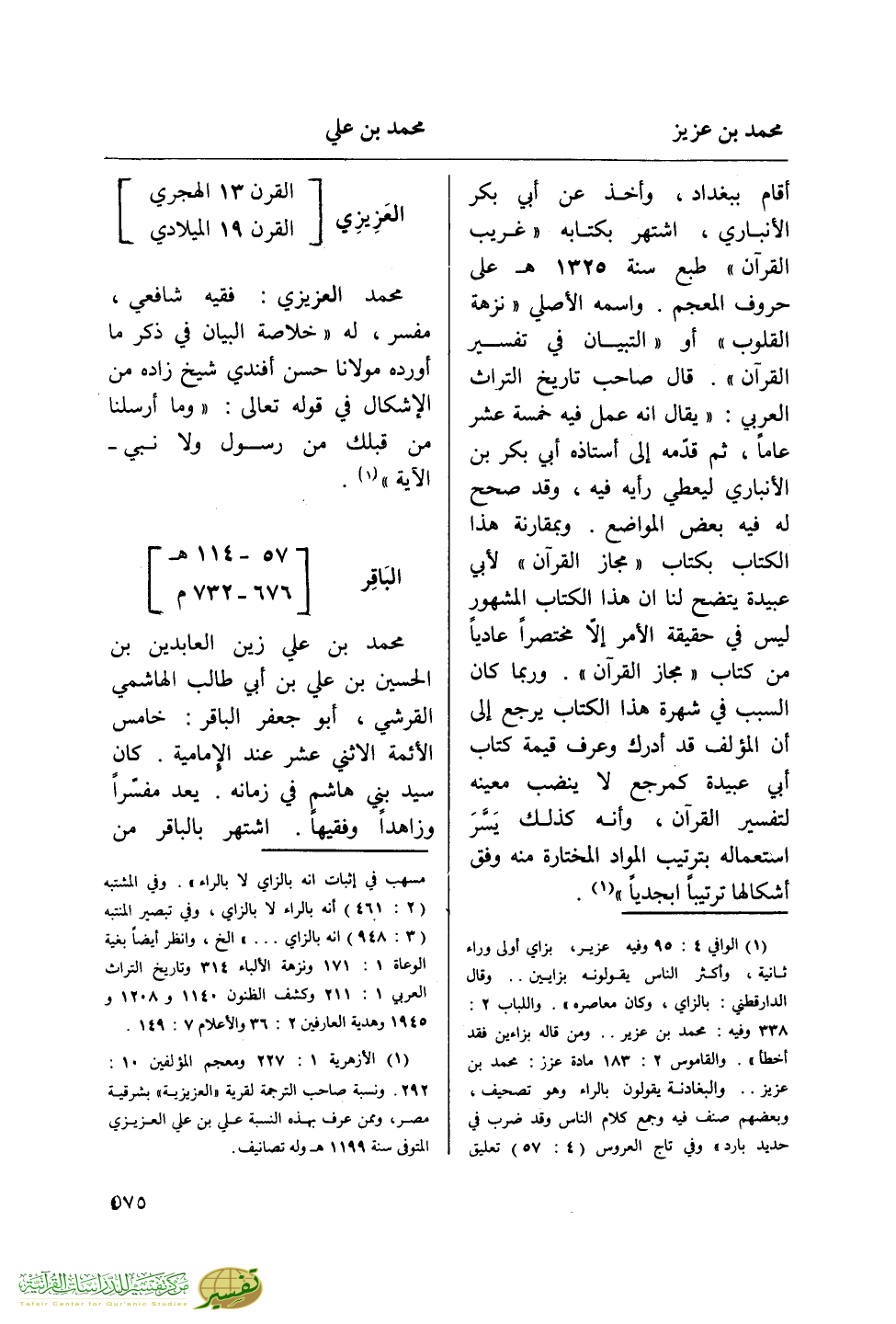 خامس الأئمة الإثني عشر عند الإمامية. كان سيد بني هاشم في زمانه. يعد مفسرا وزاهدا وفقيها. اشتهر بالباقر من مسهب في إثبات أنه بالزاي لا بالراء". وفي المشتبه (2: 4601) أنه بالراء لا بالزاي، وفي تبصير المنتبه (3: 948) أنه بالزاي ... " الخ، وانظر أيضا بغية الوعاة 1: 171 ونزهة الألباء 314 وتاريخ التراث العربي 1: 211 وكشف الظنون 1140 و 1208 و 1945 وهدية العارفين 2: 36 والأعلام 7: 149.