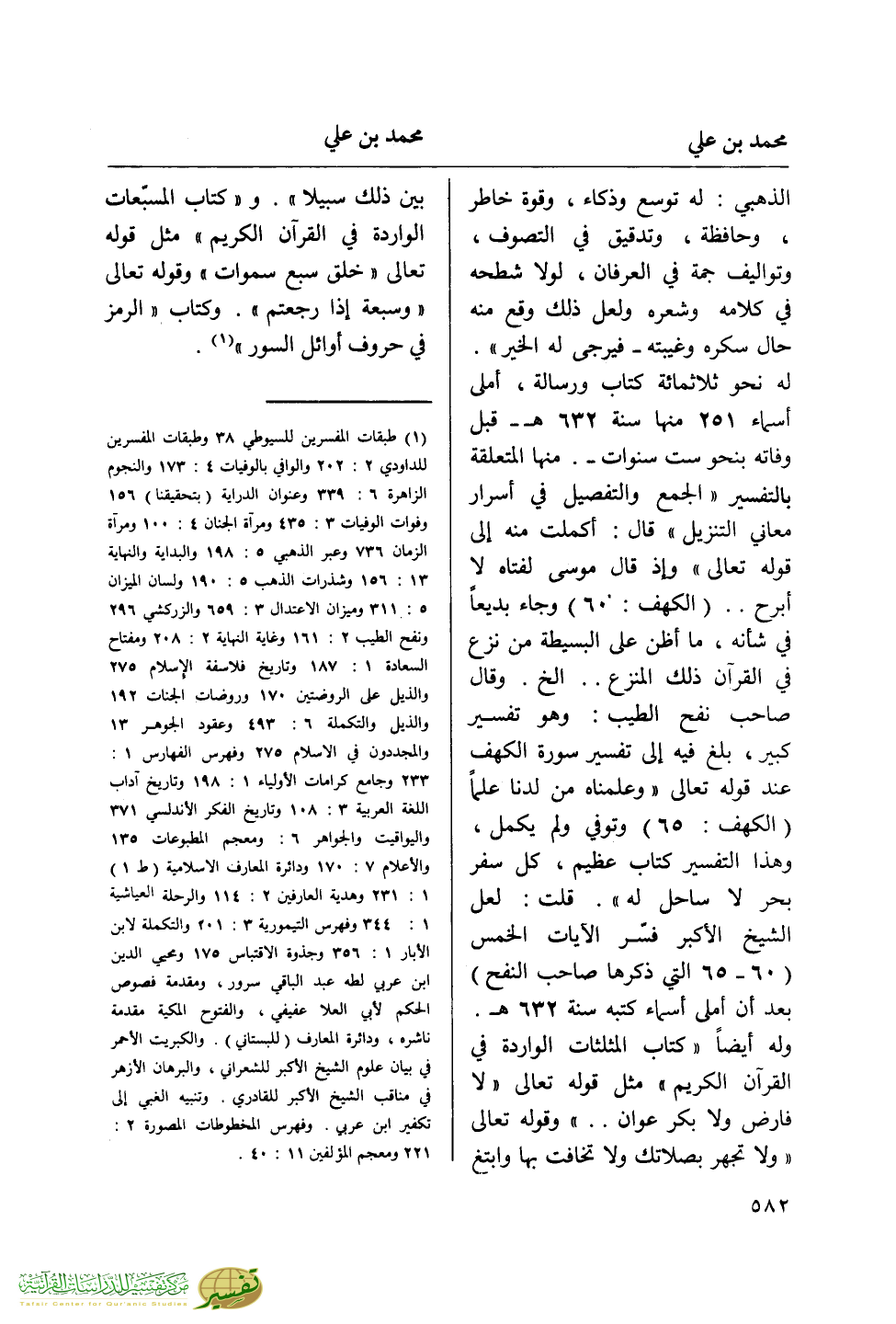 (¬1) طبقات المفسرين للسيوطي 38 وطبقات المفسرين للداودي 2: 202 والوافي بالوفيات 4: 173 والنجوم الزاهرة 6: 339 وعنوان الدراية (بتحقيقنا) 156 وفوات الوفيات 3: 435 ومرآة الجنان 4: 100 ومرآة الزمان 736 وعبر الذهبي 5: 198 والبداية والنهاية 13: 156 وشذرات الذهب 5: 195 ولسان الميزان 5: 311 وميزان الاعتدال 3: 659 والزركشي 296 ونفح الطيب 2: 161 وغاية النهاية 2: 208 ومفتاح السعادة 1: 187 وتاريخ فلاسفة الإسلام 275 والذيل على الروضتين 170 وروضات الجنات 192 والذيل والتكملة 6: 493 وعقود الجوهر 13 والمجددون في الإسلام 275 وفهرس الفهارس 1: 233 وجامع كرامات الأولياء 1: 198 وتاريخ آداب اللغة العربية 3: 108 وتاريخ الفكر الأندلسي 371 واليواقيت والجواهر 6: ومعجم المطبوعات 135 والأعلام 7: 170 ودائرة المعارف الإسلامية (ط 1) 1: 231 وهدية العارفين 2: 114 والرحلة العياشية 1: 344 وفهرس التيمورية 3: 101 والتكملة لابن الأبار 1: 356 وجذوة الاقتاس 175 ومحيي الدبن ابن عربي لطه عبد الباقي سرور، ومقدمة فصوص الحكم لأبي العلا عفيفي، والفتوح المكية مقدمة ناشره، ودائرة المعارف (للبستاني). والكبريت الأحمر في بيان علوم الشيخ الأكبر للشعراني، والبرهان الأزهر في مناقب الشيخ الأكبر للقادري. وتنبيه الغبي إلى تكفير ابن عربي. وفهرس المخطوطات المصورة 2: 221 ومعجم المؤلفين 11: 40.