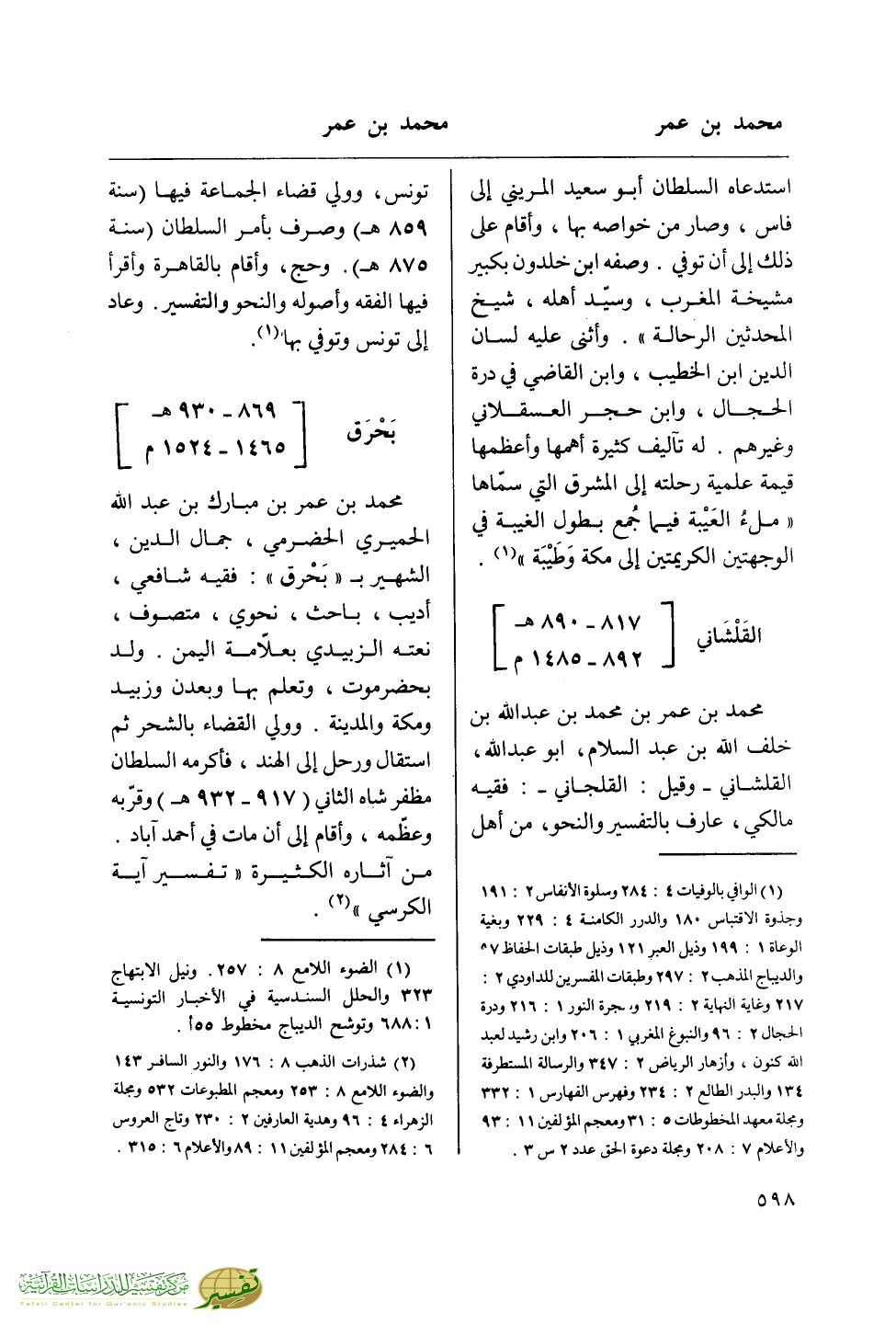 (¬2) شذرات الذهب 8: 176 والنور السافر 143 والضوء اللامع 8: 253 ومعجم المطبوعات 532 ومجلة الزهراء 4: 96 وهدية العارفين 2: 230 وتاج العروس 6: 284 ومعجم المؤلفين 11: 89 والأعلام 6: 315.