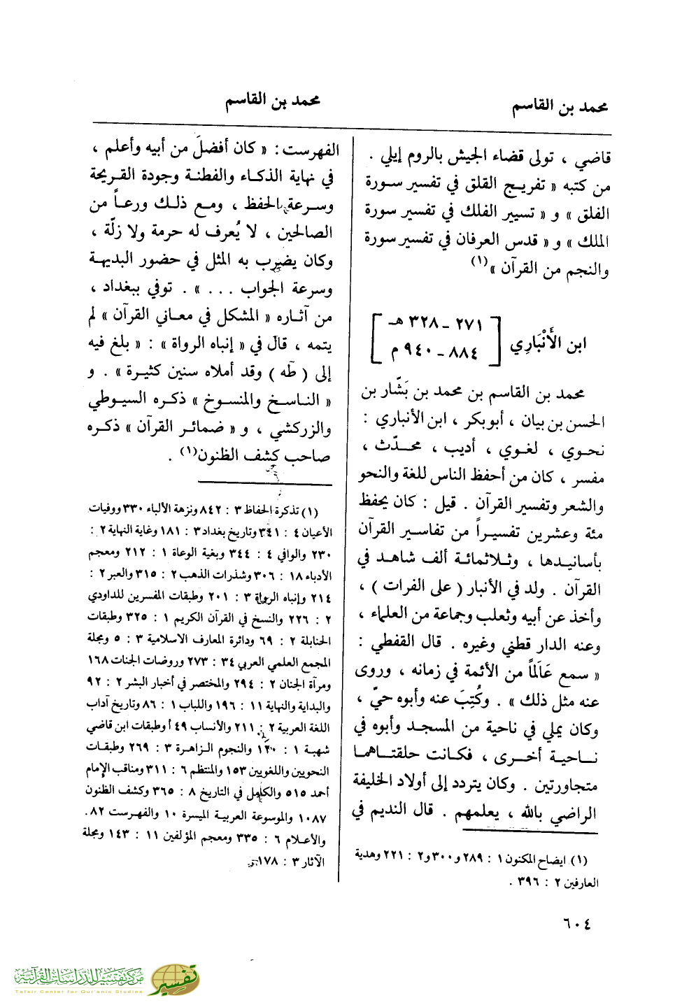 (¬1) تذكرة الحفاظ 3: 842 ونزهة الألباء 330 ووفيات الأعيان 4: 341 وتاريخ بغداد 3: 181 وغاية النهاية 2: 230 والوافي 4: 344 وبغية الوعاة 1: 212 ومعجم الأدباء 18: 306 وشذرات الذهب 2: 315 والعبر 2: 214 وإنباه الرواة 3: 201 وطبقات المفسرين للداودي 2: 226 والنسخ في القرآن الكريم 1: 325 وطبقات الحنابلة 2: 69 ودائرة المعارف الإسلامية 3: 5 ومجلة المجمع العلمي العربي 34: 273 وروضات الجنات 168 ومرآة الجنان 2: 291 والمختصر في أخبار البشر 2: 92 والبداية والنهاية 11: 196 واللباب 1: 86 وتاريخ آداب اللغة العربية 2: 211 والأنساب 149 وطبقات ابن قاضي شهبة 1: 120 والنجوم الزاهرة 3: 269 وطبقات النحويين واللغويين 153 والمنتظم 6: 311 ومناقب الإمام أحمد 515 والكامل في التاريخ 8: 365 وكشف الظنون 1087 والموسوعة العربية الميسرة 10 والفهرست 82. والأعلام 6: 335 ومعجم المؤلفين 11: 143 ومجلة الآثار 3: 178.