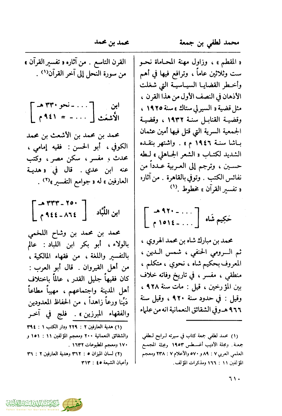 (¬1) محمد لطفي جمعة كتاب في سيرته لرابح لطفي جمعة. ومجلة الأديب أغطس 1953، مجلة المجمع العلمي العربي 7: 89 و 570 والأعلام 7: 238 ومعجم المؤلفين 11: 166 ومذكرات المؤلف.