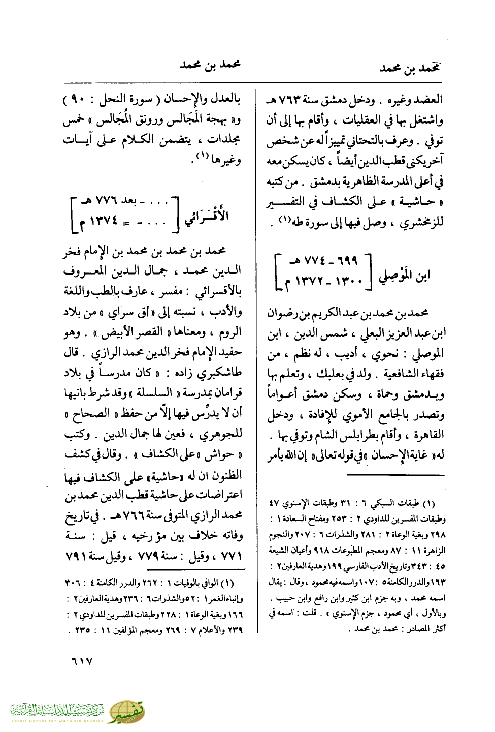 (¬1) طبقات السبكي 6: 31 وطبقات الإسنوي 47 وطبقات المفسرين للداودي 2: 253 ومفتاح السعادة 1: 298 وبغية الوعاة 2: 281 والشذرات 6: 207 والنجوم الزاهرة 11: 87 ومعجم المطبوعات 918 وأعيان الشيعة 45: 343 وتاريخ الأدب الفارسي 199 وهدية العارفين 2: 163 والدرر الكامنة 5: 107 واسمه فيه محمود، وقال: يقال اسمه محمد، وبه جزم ابن كثير وابن رافع وابن حبيب. وبالأول، أي محمود، جزم الإسنوي". قلت: اسمه في أكثر المصادر: محمد بن محمد.