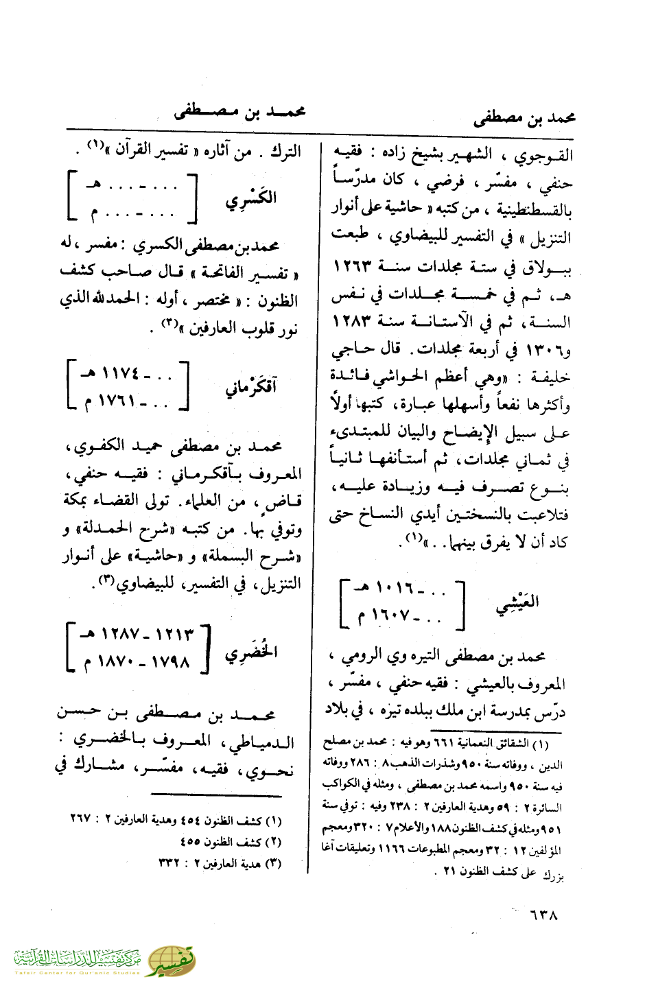 (¬1) الشقائق النعمانية 661 وهو فيه: محمد بن مصلح الدين، ووفاته سنة 950 وشذرات الذهب 8: 286 ووفاته فيه سنة 950 واسمه محمد بن مصطفى، ومثله في الكواكب السائرة 2: 59 وهدية العارفين 2: 238 وفيه: توفي سنة 951 ومثله في كشف الظنون 188 والأعلام 7: 320 ومعجم المؤلفين 12: 32 ومعجم المطبوعات 1166 وتعليقات آغا بزرك على كشف الظنون 21.