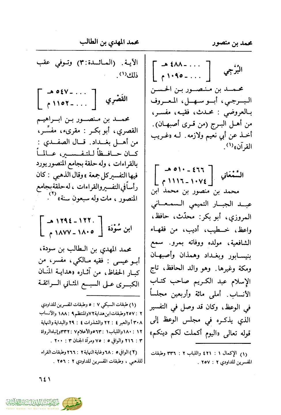 (¬1) طبقات السبكي 7: 5 وطبقات المفسرين للداودي 2: 257 وطبقات ابن هداية 72 والمنتظم 9: 188 والأنساب 308 أو العبر 4: 22 والشذرات 4: 29 والبداية والنهاية 12: 180 واللباب 1: 563 والأعلام 7: 332 وإنباء الرواة 3: 216 والوافي 5: 75 ومرآة الجنان 3: 200.