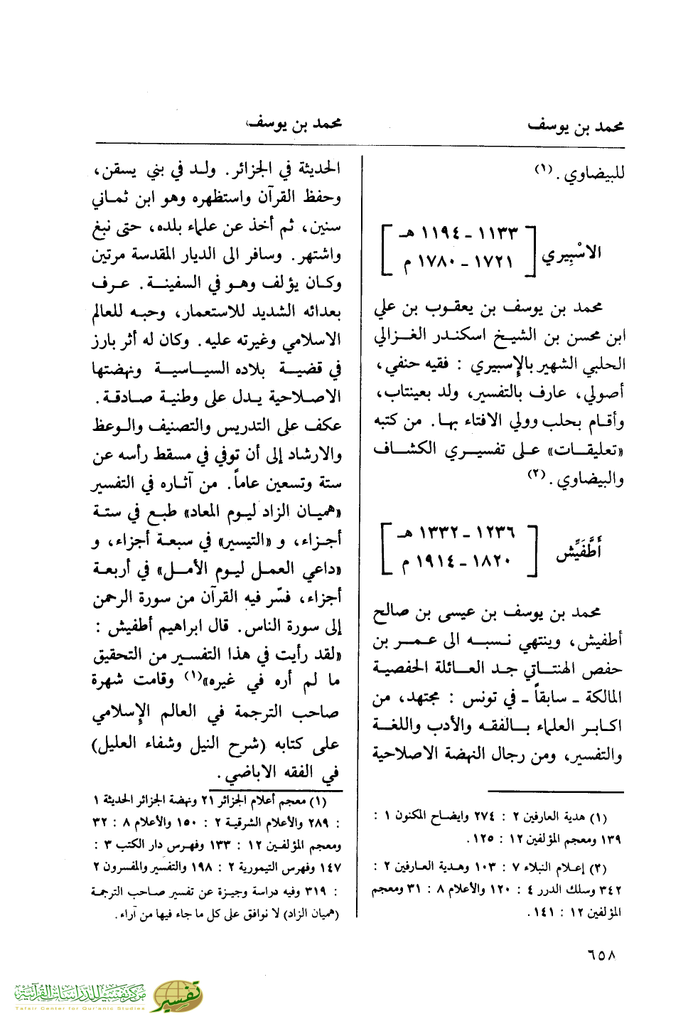 الحديثة في الجزائر. ولد في بني يسقن، وحفظ القرآن واستظهره وهو ابن ثماني سنين، ثم أخذ عن علماء بلده، حتى نبغ واشتهر. وسافر إلى الديار المقدسة مرتين وكان يؤلف وهو في السفينة. عرف بعدائه الشديد للاستعمار، وحبه للعالم الإسلامي وغيرته عليه. وكان له أثر بارز في قضية بلاده السياسية ونهضتها الإصلاحية يدل على وطنية صادقة. عكف على التدريس والتصنيف والوعظ والإرشاد إلى أن توفي في مسقط رأسه عن ستة وتسعين عاما. من آثاره في التفسير "هميان الزاد ليوم المعاد" طبع في ستة أجزاء، و "التيسير" في سبعة أجزاء، و "داعي العمل ليوم الأمل" في أربعة أجزاء، فسر فيه القرآن من سورة الرحمن إلى سورة الناس. قال إبراهيم أطفيش: "لقد رأيت في هذا التفسير من التحقيق ما لم أره في غيره" (¬1) وقامت شهرة صاحب الترجمة في العالم الإسلامي على كتابه (شرح النيل وشفاء العليل) في الفقه الأباضي.