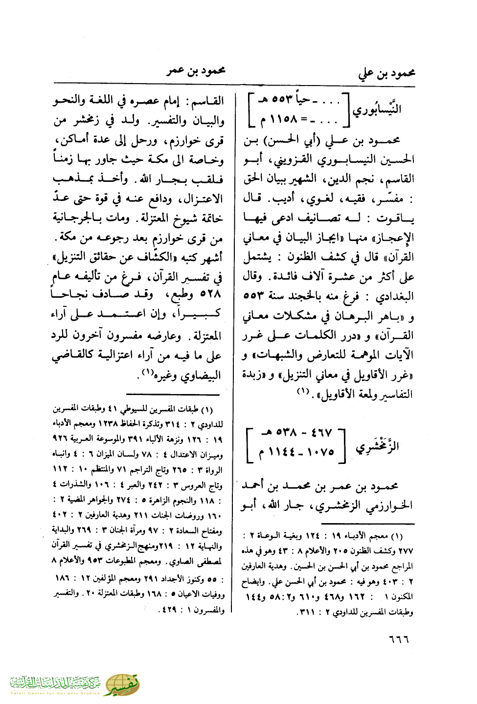 القاسم: إمام عصره في اللغة والنحو والبيان والتفسير. ولد في زمخشر من قرى خوارزم، ورحل إلى عدة أماكن، وخاصة إلى مكة حيث جاور بها زمنا فلقب بجار الله. وأخذ بمذهب الإعتزال، ودافع عنه في قوة حقا عد خاتمة شيوخ المعتزلة. ومات بالجرجانية من قرى خوارزم بعد رجوعه من مكة. أشهر كتبه "الكشاف عن حقائق التنزيل" فى تفسير القرآن، فرغ من تأليفه عام 528 وطبع، وقد صادف نجاحا كبيرا، وإن اعتمد على آراء المعتزلة. وعارضه مفسرون آخرون للرد على ما فيه من آراء اعتزالية كالقاضي البيضاوي وغيره (¬1).