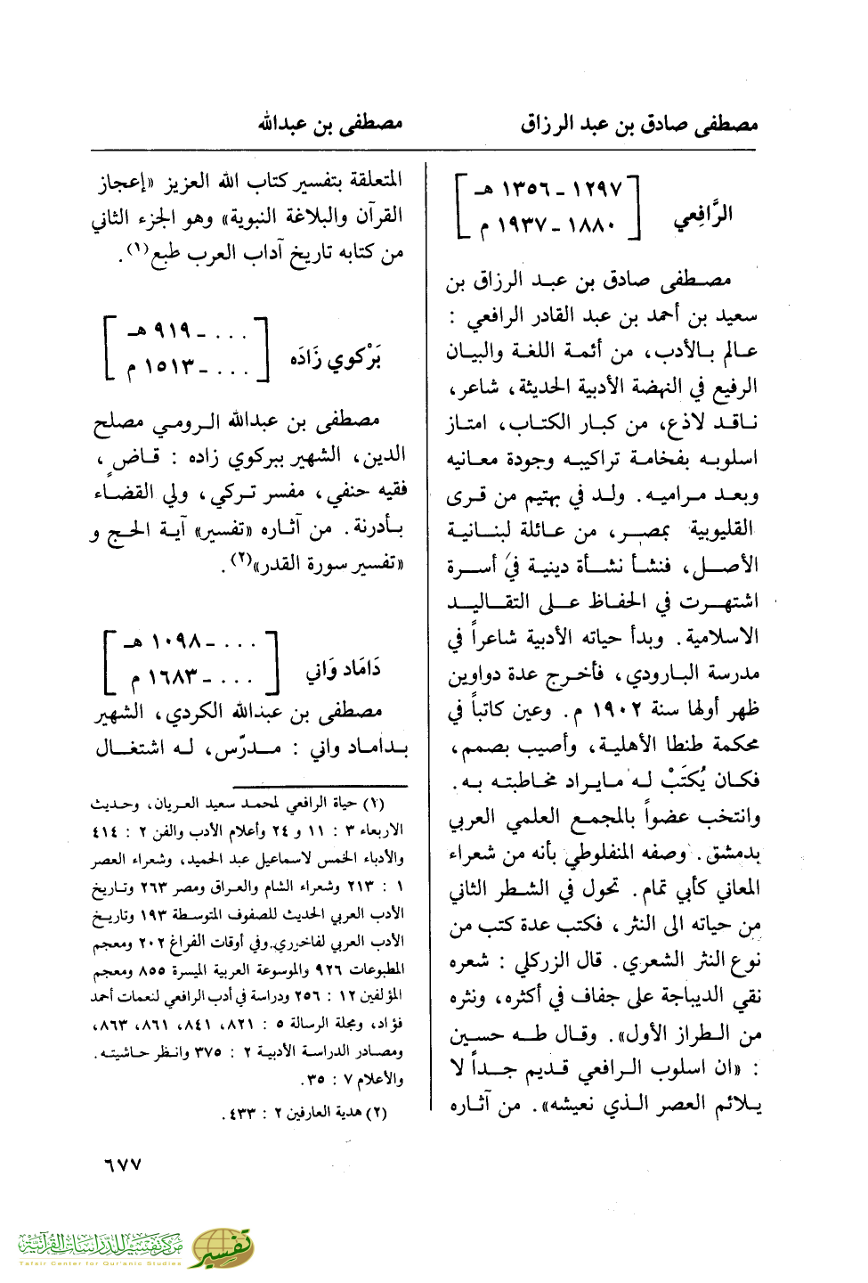 (¬1) حياة الرافعي لمحمد سعيد العريان، وحديث الأربعاء 3: 11 و 24 وأعلام الأدب والفن 2: 414 والأدباء الخمس لإسماعيل عبد الحميد، وشعراء العصر 1: 213 وشعراء الشام والعراق ومصر 263 وتاريخ الأدب العربي الحديث للصفوف المتوسطة 193 وتاريخ الأدب العربي لفاخوري وفي أوقات الفراغ 202 ومعجم المطبوعات 926 والموسوعة العربية الميسرة 855 ومعجم المؤلفين 12: 256 ودراسة في أدب الرافعي لنعمات أحمد فؤاد، ومجلة الرسالة 5: 821، 841، 861، 863، ومصادر الدراسة الأدبية 2: 375 وانظر حاشيته. والأعلام 7: 35.