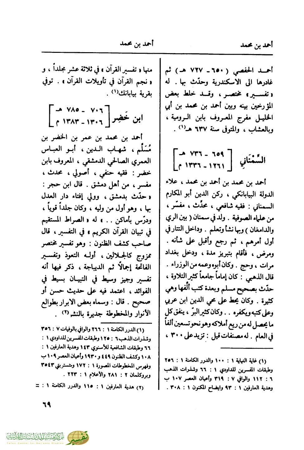(¬1) غاية النهاية 1: 100 والدرر الكامنة 1: 256 وطبقات المفسرين للداودي 1: 66 وشذرات الذهب 6: 112 والوافي 7: 319 وأعيان العصر 107 ب وهدية العارفين 1: 93 وإيضاح المكنون 1: 308.