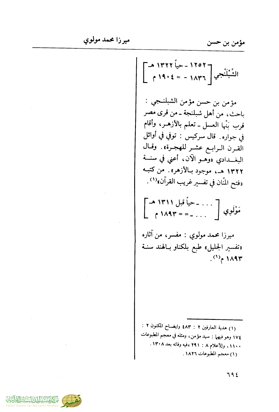(¬1) هدية العارفين 2: 483 وإيضاح المكنون 2: 174 وهو فيهما: سيد مؤمن، ومثله في معجم المطبوعات 1100، والأعلام 8: 291 وفيه وفاته بعد 1308.