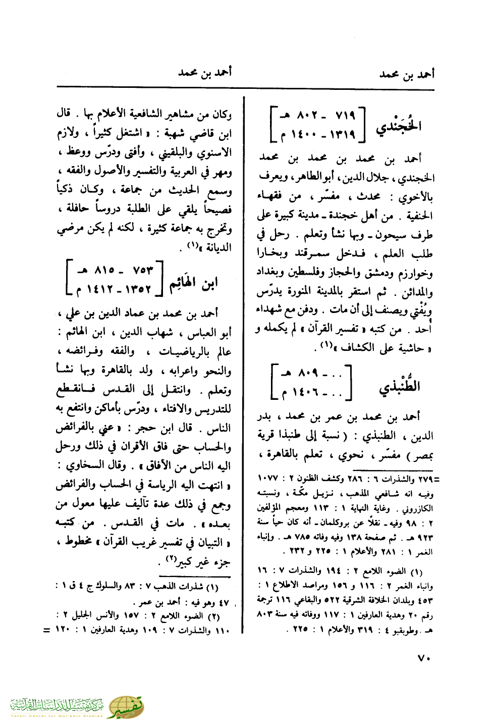 (¬1) الضوء اللامع 2: 194 والشذرات 7: 16 وانباء الغمر 2: 116 و 156 ومراصد الاطلاع 1: 453 وبلدان الخلافة الشرقية 522 والبقاعي 116 ترجمة رقم 20 وهدية العارفين 1: 117 ووفاته فيه سنة 803 هـ. وطوبقبو 4: 319 والأعلام 1: 225.