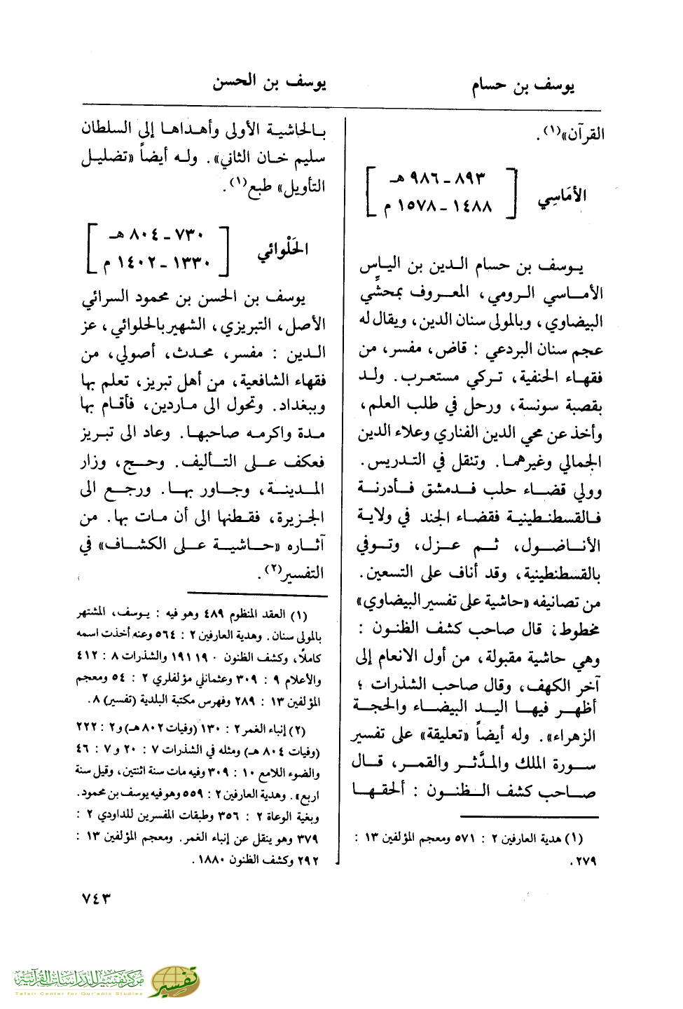 (¬2) إنباء الغمر 2: 130 (وفيات 802 هـ) و 2: 222 (وفيات 804 هـ) ومثله في الشذرات 7: 20 و 7: 46 والضوء اللامع 10: 309 وفيه مات سنة اثنتين، وقيل سنة أربع". وهدية العارفين 2: 559 وهو فيه يوسف بن محمود. وبغية الوعاة 2: 356 وطبقات المفسرين للداودي 2: 379 وهو ينقل عن إنباء الغمر. ومعجم المؤلفين 13: 292 وكشف الظنون 1880.