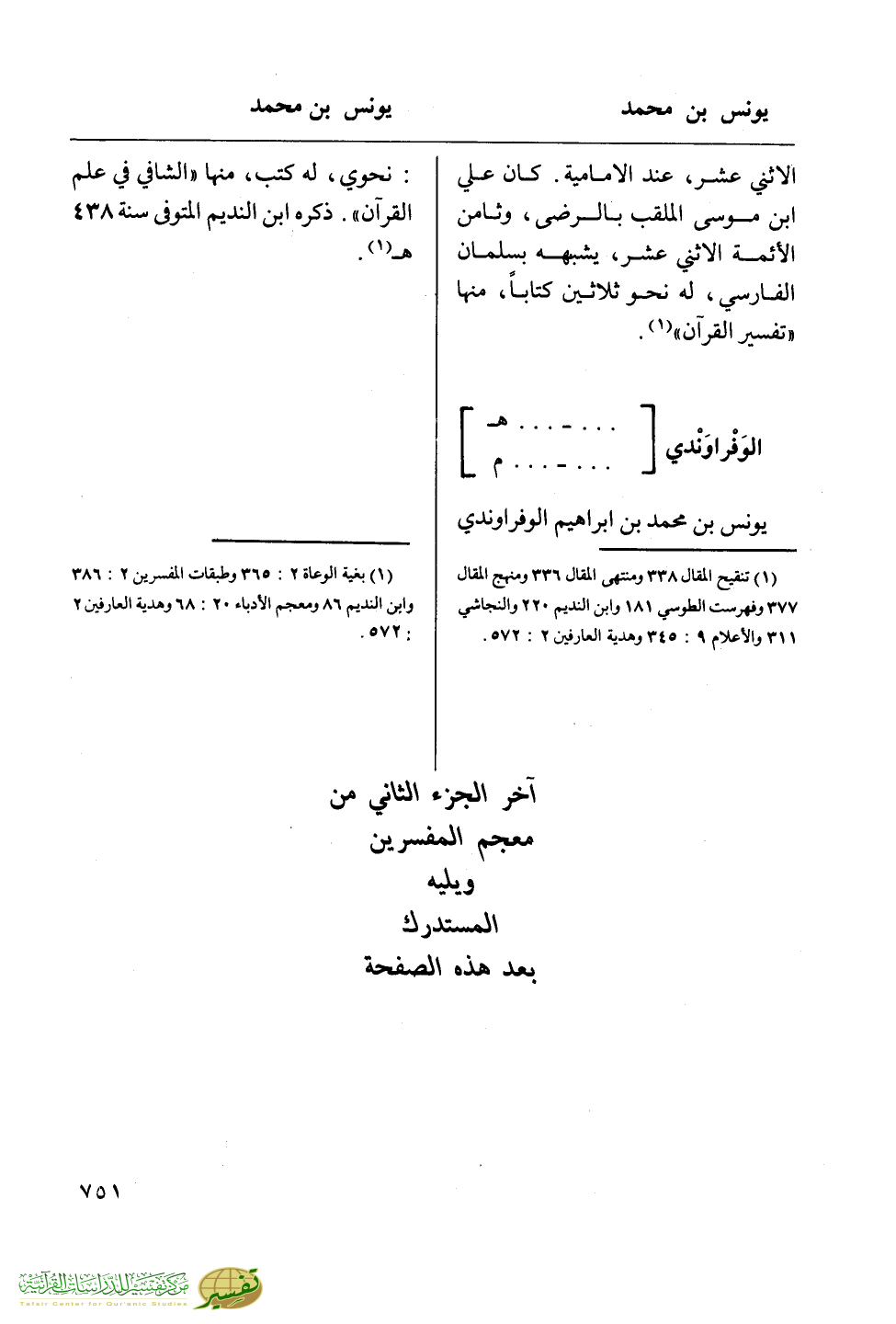 (¬1) بغية الوعاة 2: 365 وطبقات المفسرين 2: 386 وابن النديم 86 ومعجم الأدباء 20: 68 وهدية العارفين 2: 572. آخر الجزء الثاني من معجم المفسرين ويليه المستدرك بعد هذه الصفحة