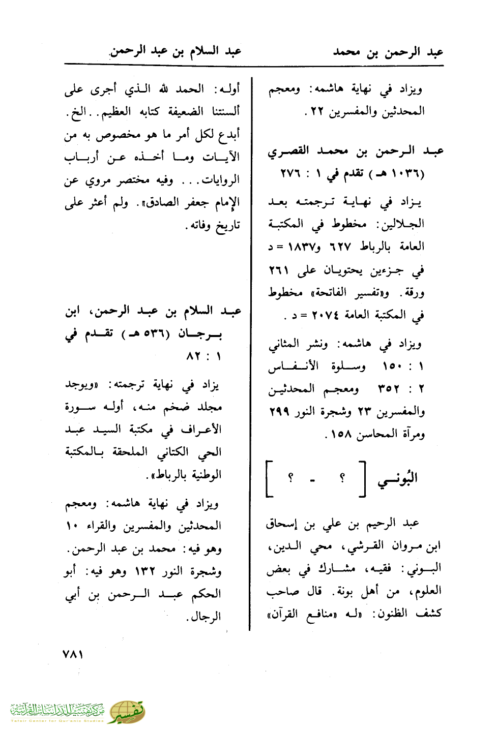 في جزءين يحتويان على 261 ورقة. و "تفسير الفاتحة" مخطوط في المكتبة العامة 2074 - د. ويزاد في هاشمه: ونشر المثاني 1: 150 وسلوة الأنفاس 2: 352 ومعجم المحدثين والمفسرين 23 وشجرة النور 299 ومرآة المحاسن 158. البوني [؟ -؟]