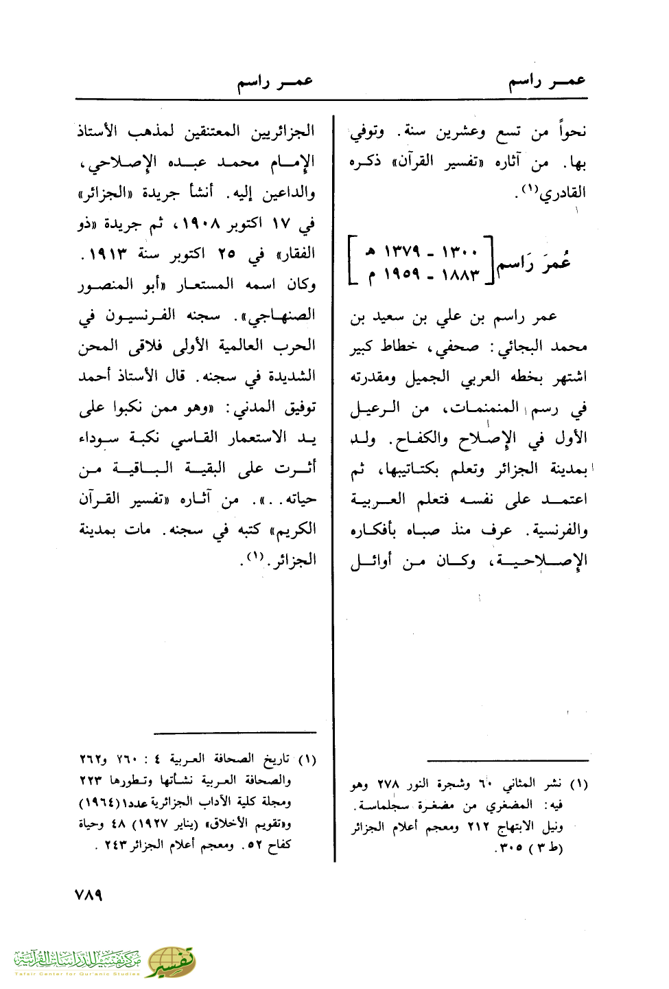 (¬1) تاريخ الصحافة العربية 4: 260 و 262 والصحافة العربية نشأتها وتطورها 223 ومجلة كلية الآداب الجزائرية عدد 1 (1964) و "تقويم الأخلاق" (يناير 1927) 48 وحياة كفاح 52. ومعجم أعلام الجزائر 243.