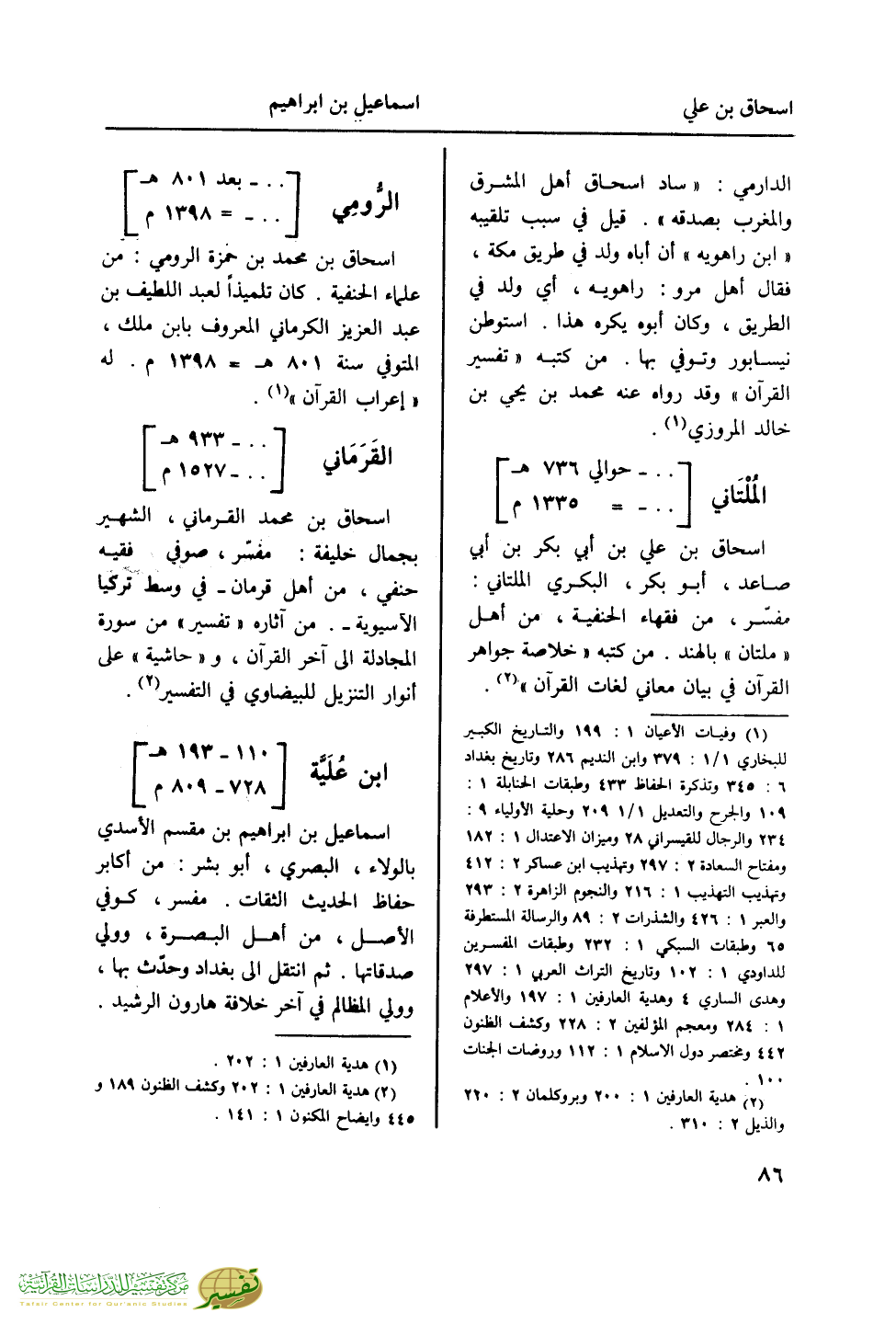 الدارمي: "ساد إسحاق اهل المشرق والمغرب بصدقه". قيل في سبب تلقيبه "ابن راهويه" أن أباه ولد في طريق مكة، فقال أهل مرو: راهويه، أي ولد في الطريق، وكان أبوه يكره هذا. استوطن نيسابور وتوفي بها. من كتبه "تفسير القرآن" وقد رواه عنه محمد بن يحي بن خالد المروزي (¬1). الملتاني [.. - حوالي 736 هـ .. - حوالي 1335 م]