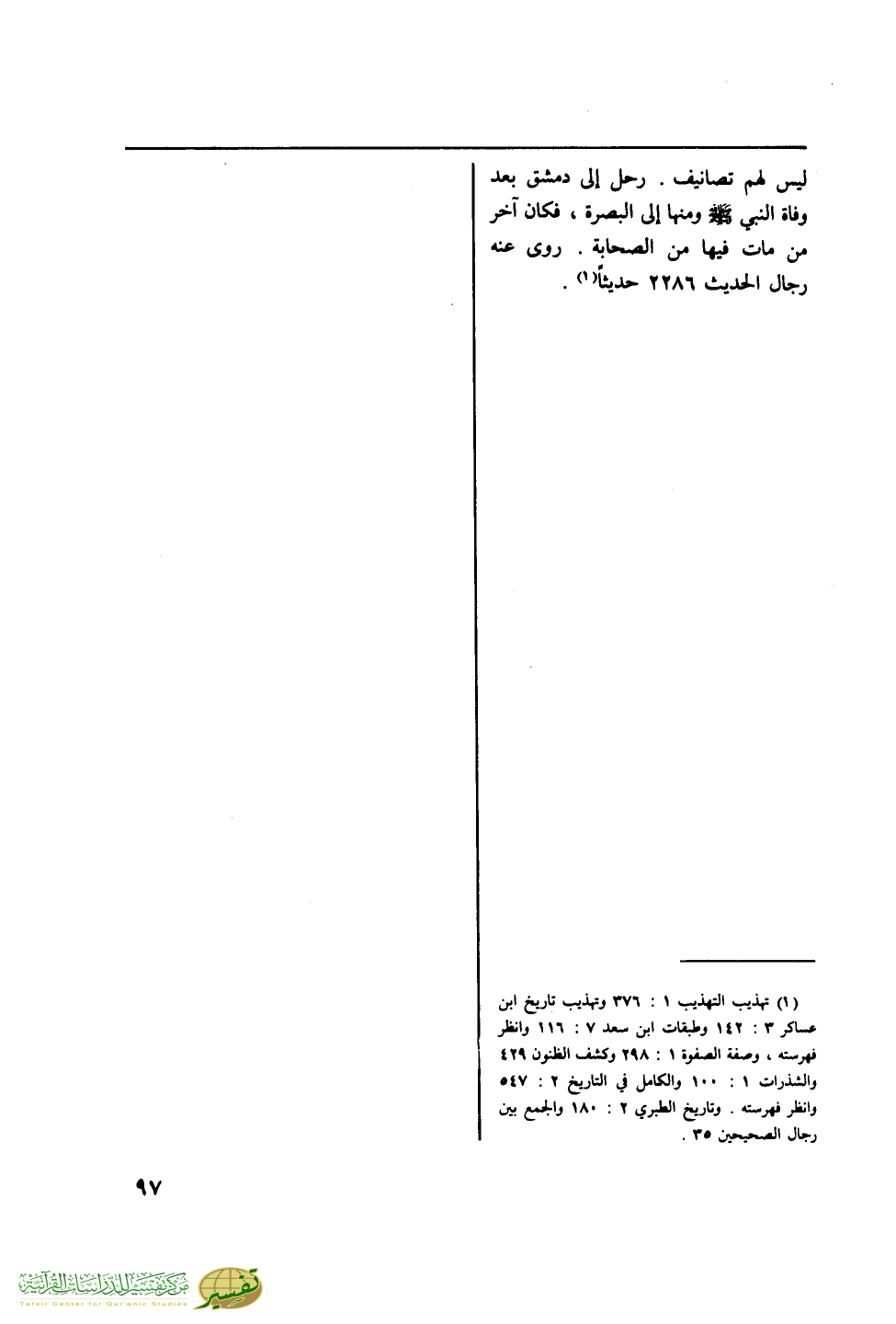 (¬1) تهذيب التهذيب 1: 376 وتهذيب تاريخ ابن عساكر 3: 142 وطبقات ابن سعد 7: 116 وانظر فهرسته، وصفة الصفوة 1: 298 وكشف الظنون 429 والشذرات 1: 100 والكامل في التاريخ 2: 547 وانظر فهرسته. وتاريخ الطبري 2: 180 والجمع بين رجال الصحيحين 35.