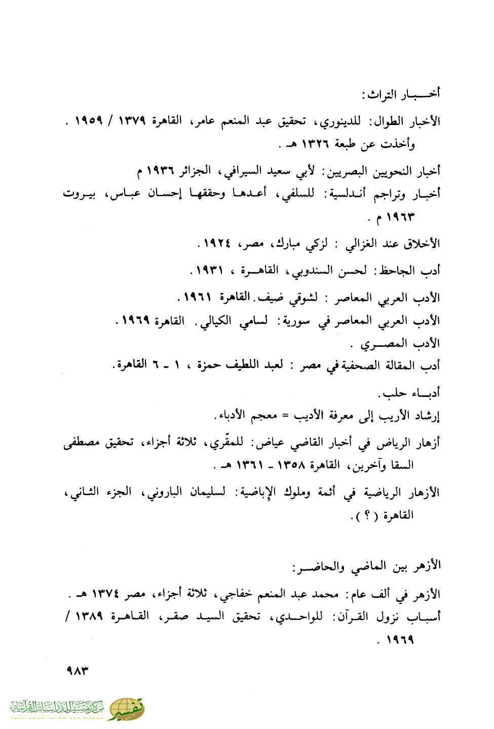 الأزهر في ألف عام: محمد عبد المنعم خفاجي، ثلاثة أجزاء، مصر 1374 م.