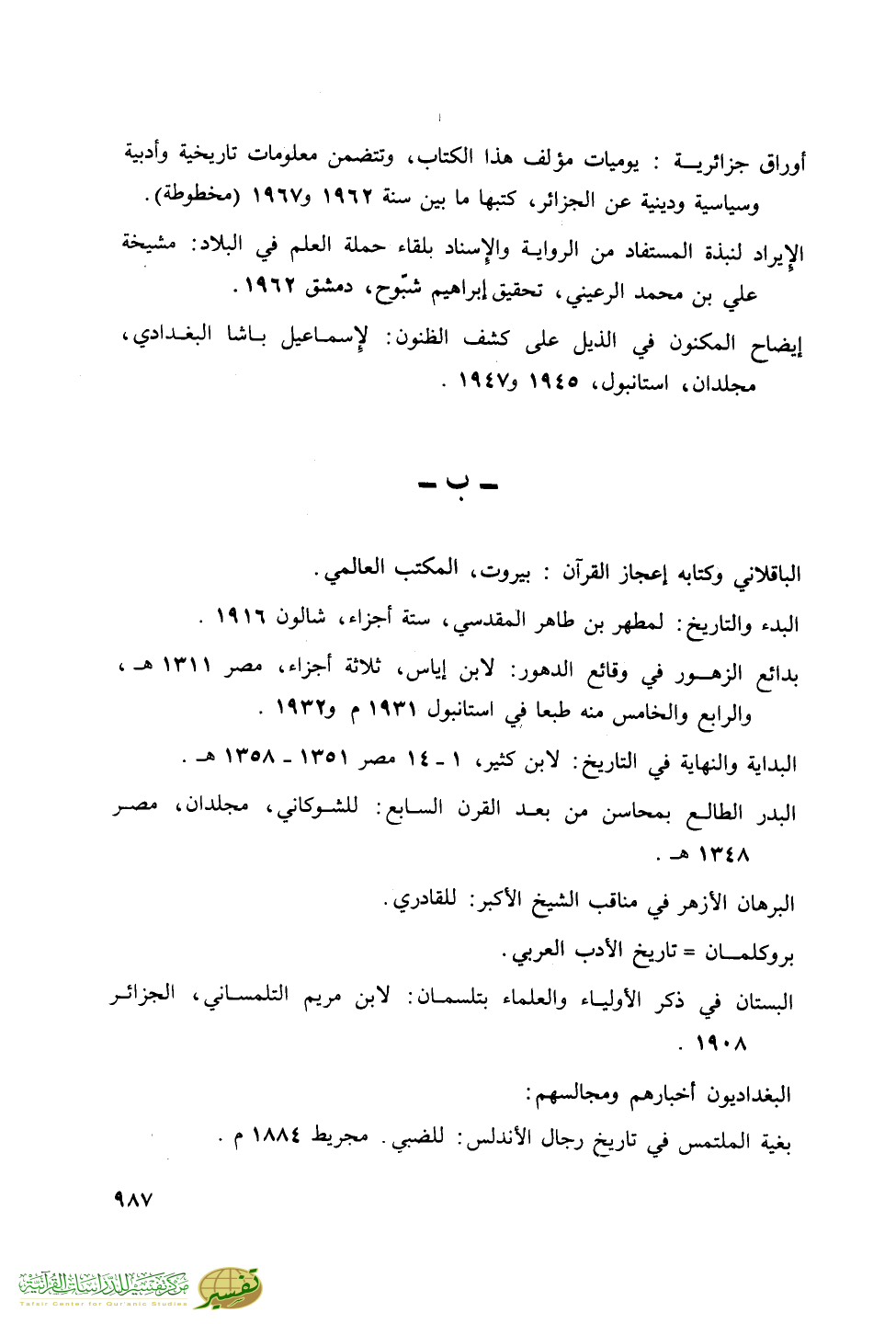 إيضاح المكنون في الذيل على كشف الظنون: لإسماعيل باشا البغدادي، مجلدان، استانبول، 1945 و 1947.