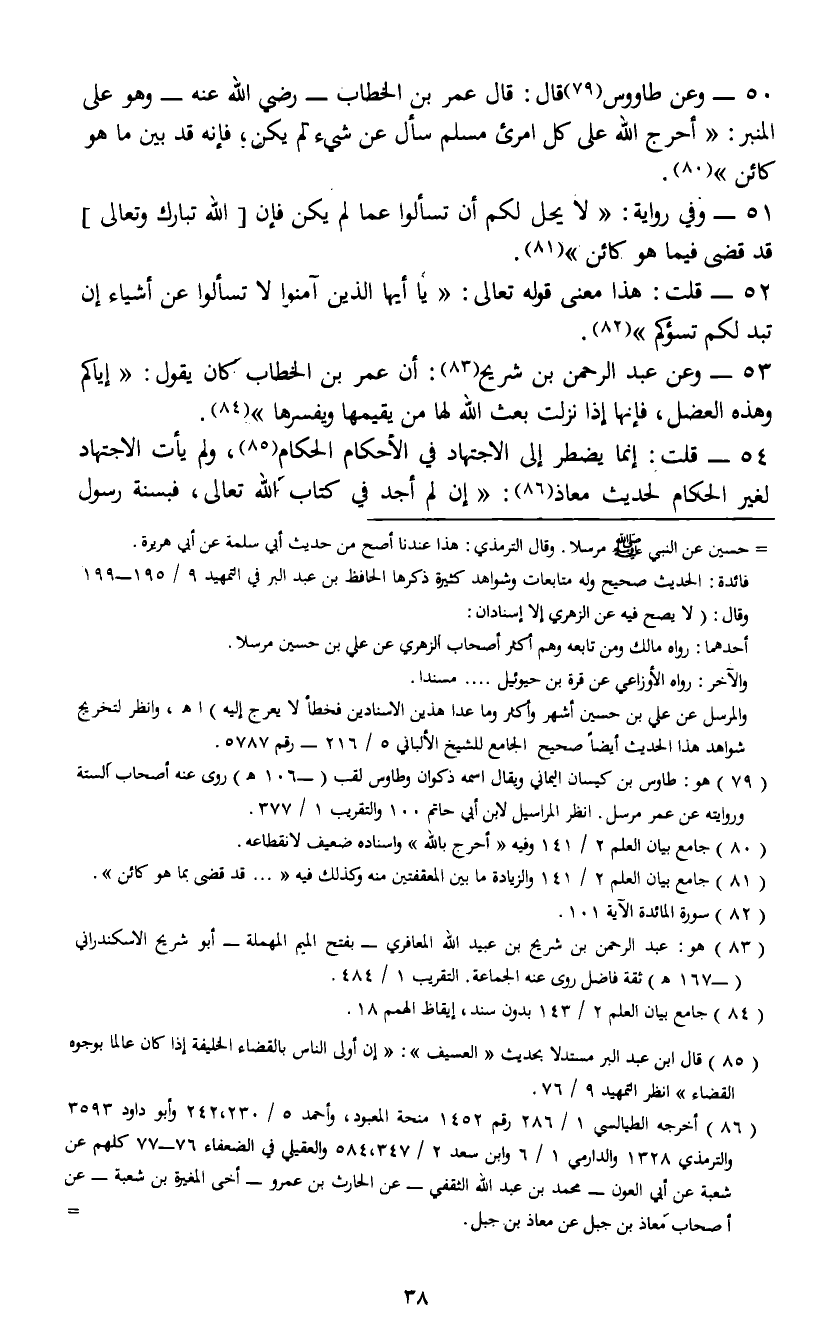 54 - قلت إِنَّمَا يضْطَر إِلَى الِاجْتِهَاد فِي الْأَحْكَام الْحُكَّام وَلم يَأْتِ الِاجْتِهَاد لغير الْحُكَّام لحَدِيث معَاذ (إِن لم أجد فِي كتاب الله تَعَالَى فبسنة رَسُول