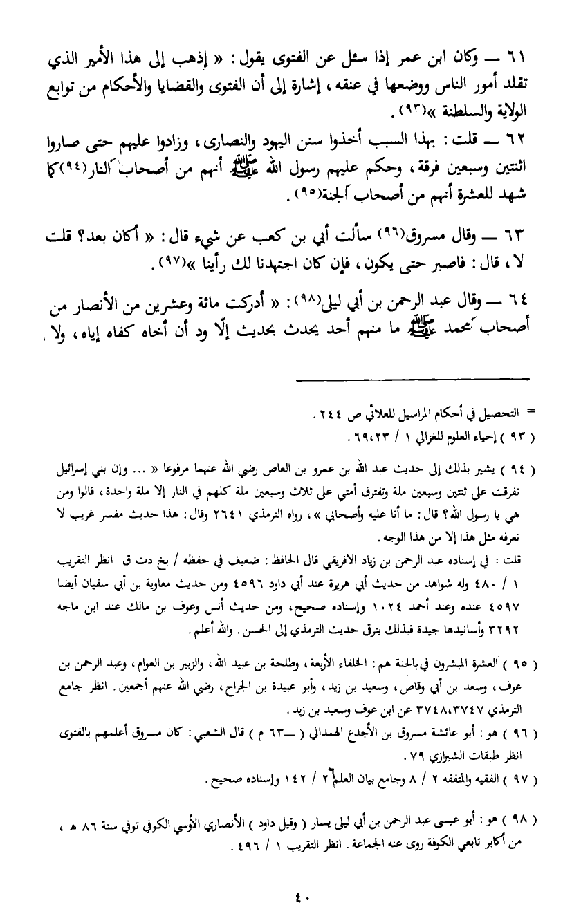 61 - وَكَانَ ابْن عمر إِذا سُئِلَ عَن الْفَتْوَى يَقُول إذهب إِلَى هَذَا الْأَمِير الَّذِي تقلد أُمُور النَّاس ووضعها فِي عُنُقه إِشَارَة إِلَى أَن الْفَتْوَى والقضايا وَالْأَحْكَام من تَوَابِع الْولَايَة والسلطنة