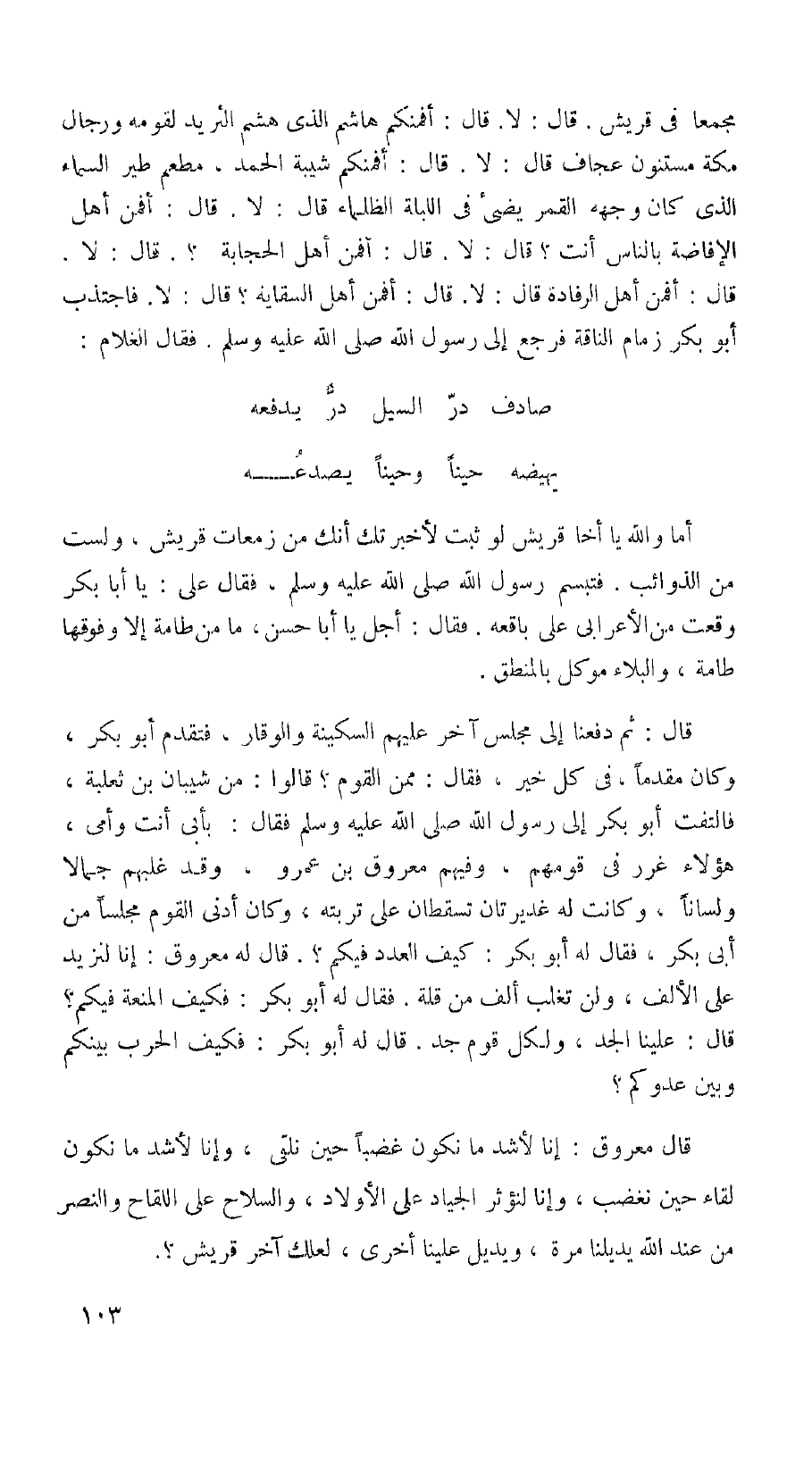 أما والله يا أخا قريش لو ثبت لأخبرتك أنك من زمعات قريش، ولست من الذوائب. فتبسم رسول الله (صلى الله عليه وسلم) فقال على: يا أبا بكر وقعت من الأعرابي على باقعه فقال: أجل يا أبا حسن، ما من طامة إلا وفوقها طامة، والبلاء موكل بالمنطق. قال: ثم دفعنا إلى مجلس آخر عليهم السكينة والوقار، فتقدم أبو بكر، وكان مقدماً، في كل خير فقال: ممن القوم؟ قالوا: من شيبان بن ثعلبة، فالتفت أبو بكر إلى رسول الله (صلى الله عليه وسلم) فقال: بأبي أنت وأمي، هؤلاء غرر في قومهم، وفيهم معروق بن عمرو، وقد غلبهم جمالا ولساناً، وكانت له غديرتان تسقطان على تربته، وكان أدنى القوم مجساً من أبي بكر، فقال له أبو بكر: كيف العدد فيكم؟. قال له معروق: أنا لنزيد على الألف، ولن تغلب ألف من قلة. فقال له أبو بكر: فكيف المنعة فيكم؟ قال: علينا الجد، ولكل قوم جد. قال له أبو بكر: فكيف الحرب بينكم وبين عدوكم؟