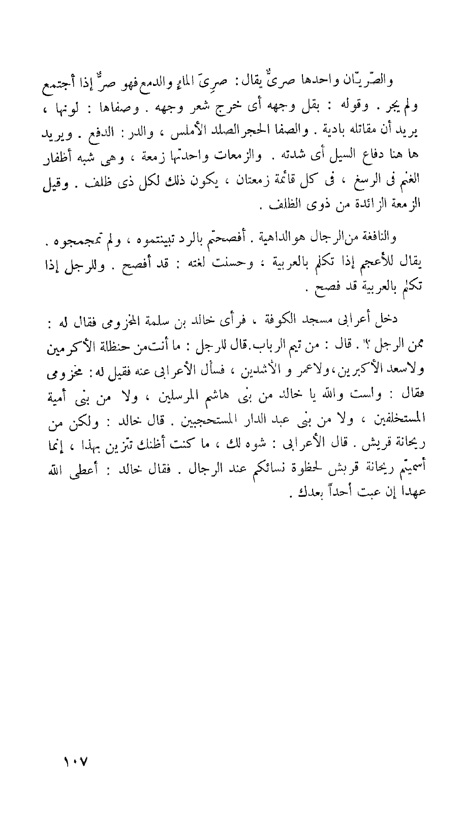 والصريان واحدها صري يقال: صري الماء والدمع فهو صر إذا اجتمع ولم يجر. وقوله: بقل وجهه أي خرج شعر وجهه. وصفاها: لونها، يريد أن مقاتله بادية. والصفا الحجر الصلد الأملس، والدر: الدفع. ويريد هاهنا دفاع السيل أي شدته. والزمعات واحدتها زمعة، وهي شبه أظفار الغنم في الرسغ، في كل قائمة زمعتان، يكون ذلك لكل ذي ظلف. وقيل الزمعة الزائدة من ذوي الظلف. والنافغة من الرجال هو الداهية. أفصحتم بالرد تبينتموه، ولم تمجمجوه. يقال للأعجم إذا تكلم بالعربية، وحسنت لغته: قد أفصح. وللرجال إذا تكلم