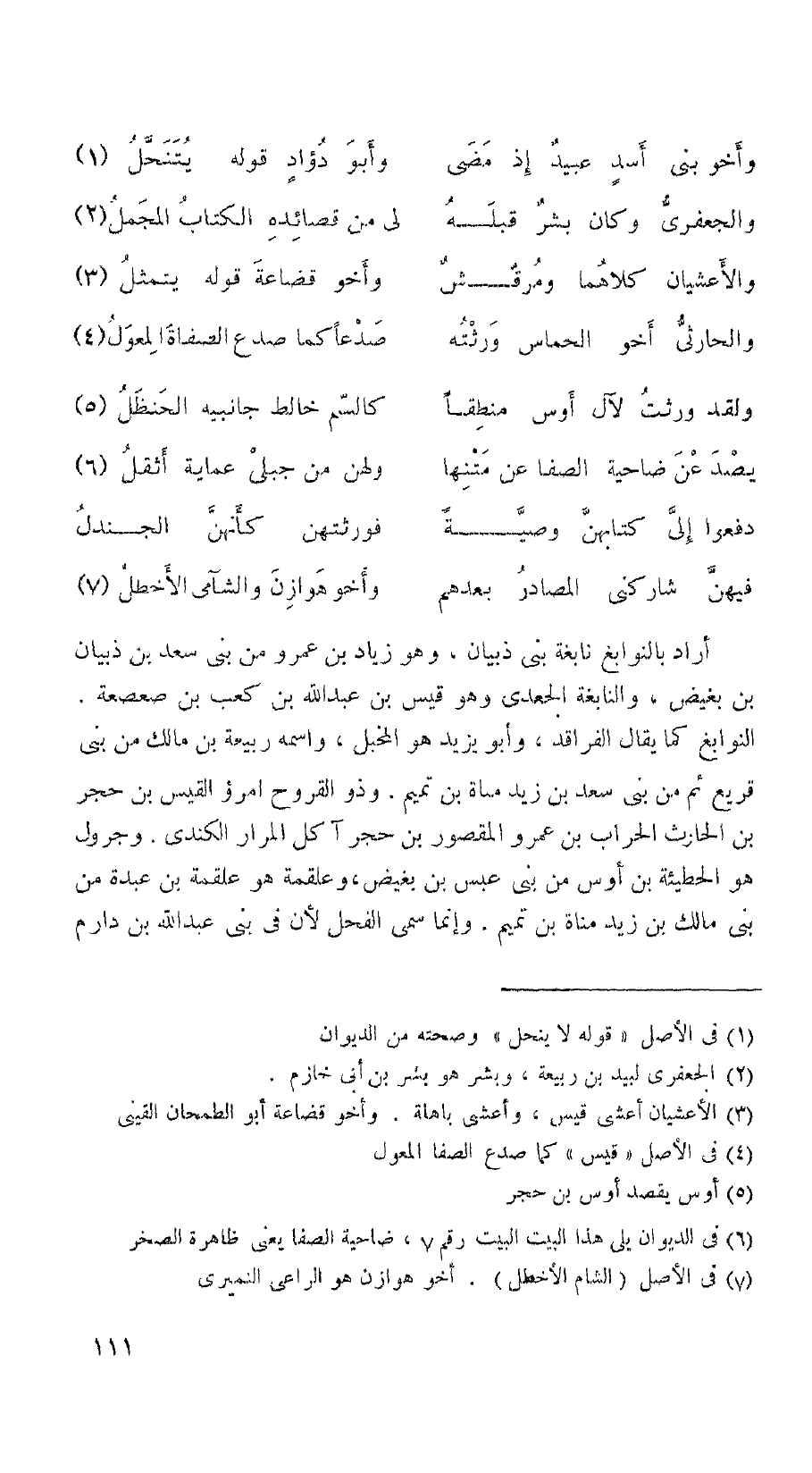 أراد بالنوابغ نابغة بني ذبيان، وهو زياد بن عمرو من بني سعد بن ذبيان بن بغيض، والنابغة الجعدي وهو قيس بن عبد الله بن كعب بن صعصعة. النوابغ كما يقال الفراقد، وأبو يزيد هو المخبل، وأسمه ربيعة بن مالك من بني قريع ثم من بني سعد بن زيد مناة بن تميم. وذو القروح امرؤ القيس بن حجر بن الحارث الحراب بن عمرو المقصور بن حجر آكل المرار الكندي. وجرول هو الحطيئة بن أوس من بني عبس بن بغيض، وعلقمة هو بن عبدة من بني مالك بن زيد مناة بن تميم. وإنما سمى الفحل لأن في بني عبد الله بن دارم