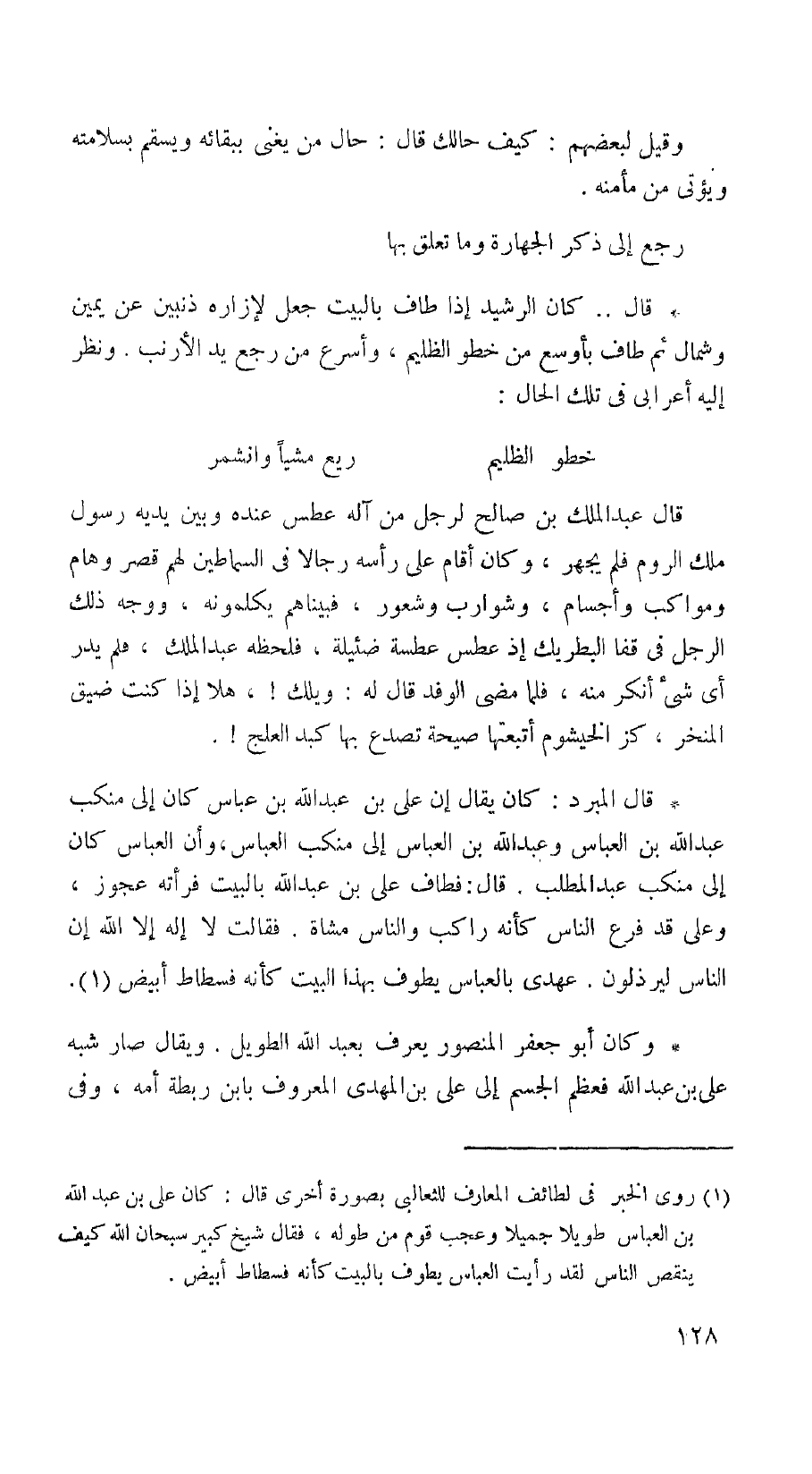قال. . كان الرشيد إذا طاف بالبيت جعل لإزاره ذنبين عن يمين وشمال ثم طاف يأوسع من خطو الظليم، وأسرع من رجع يد الأرنب. ونظر إليه أعرابي في تلك الحال: