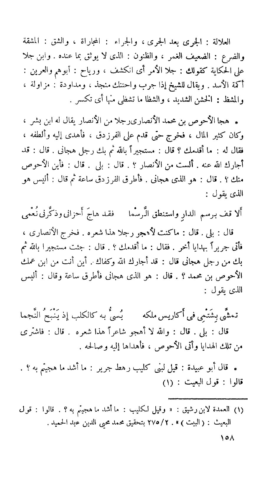 قال: بلى. قال: ما كنت لأهجو رجلا هذا شعره. فخرج الأنصاري، فأتى جريراً بهدايا أخر. فقال: ما أقدمك؟. قال: جئت مستجيرا بالله ثم بك من رجل هجاني قال: قد أجارك الله وكفاك. أين أنت من ابن عمك الأحوص بن محمد؟. قال: هو الذي هجاني فأطرق ساعة وقال: أليس الذي يقول: